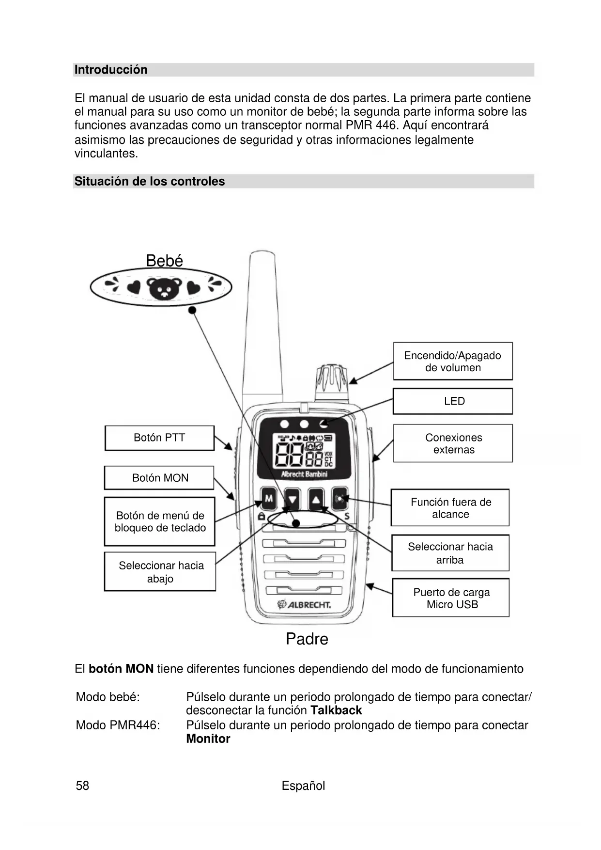 Introducción El manual de usuario de esta unidad consta de dos partes. La primera parte contiene el manual para su uso como un monitor de bebé; la segunda parte informa sobre las funciones avanzadas como un transceptor normal PMR 446. Aquí encontrará asimismo las precauciones de seguridad y otras informaciones legalmente vinculantes. Situación de los controles