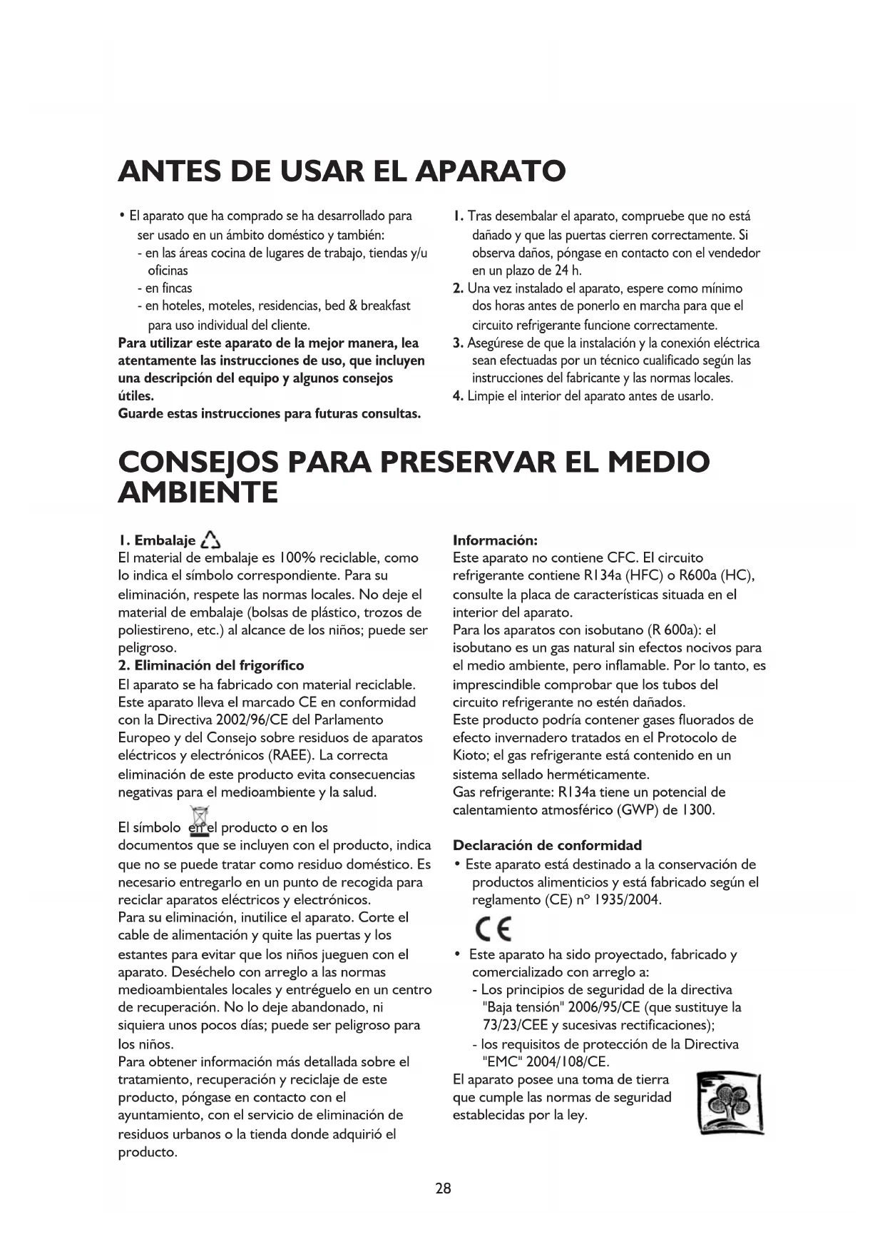 El aparato se ha fabricado con material reciclable. Este aparato lleva el marcado CE en conformidad con la Directiva 2002/96/CE del Parlamento Europeo y del Consejo sobre residuos de aparatos eléctricos y electrónicos (RAEE). La correcta eliminación de este producto evita consecuencias negativas para el medioambiente y la salud. El símbolo en el producto o en los documentos que se incluyen con el producto, indica que no se puede tratar como residuo doméstico. Es necesario entregarlo en un punto de recogida para reciclar aparatos eléctricos y electrónicos. Para su eliminación, inutilice el aparato. Corte el cable de alimentación y quite las puertas y los estantes para evitar que los niños jueguen con el aparato. Deséchelo con arreglo a las normas medioambientales locales y entréguelo en un centro de recuperación. No lo deje abandonado, ni siquiera unos pocos días; puede ser peligroso para los niños. Para obtener información más detallada sobre el tratamiento, recuperación y reciclaje de este producto, póngase en contacto con el ayuntamiento, con el servicio de eliminación de residuos urbanos o la tienda donde adquirió el producto. Información: Este aparato no contiene CFC. El circuito refrigerante contiene R134a (HFC) o R600a (HC), consulte la placa de características situada en el interior del aparato. Para los aparatos con isobutano (R 600a): el isobutano es un gas natural sin efectos nocivos para el medio ambiente, pero inflamable. Por lo tanto, es imprescindible comprobar que los tubos del circuito refrigerante no estén dañados. Este producto podría contener gases fluorados de efecto invernadero tratados en el Protocolo de Kioto; el gas refrigerante está contenido en un sistema sellado herméticamente. Gas refrigerante: R134a tiene un potencial de calentamiento atmosférico (GWP) de 1300. Declaración de conformidad