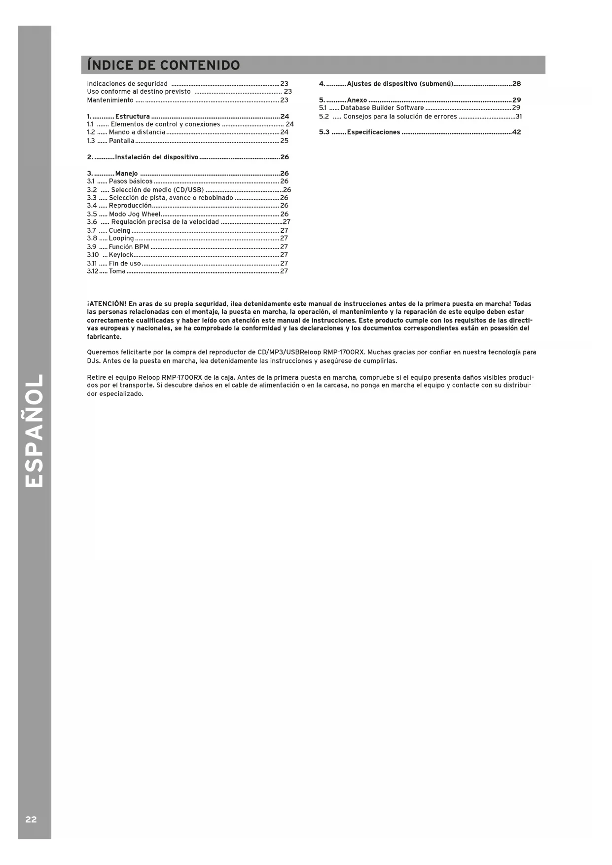 Queremos felicitarte por la compra del reproductor de CD/MP3/USBReloop RMP-1700RX. Muchas grazias por confiar en esta的技术ia para DJs. Antes de la puesta en marcha, lea detenidamente las instrucciones y asegurese de cumplirlas.