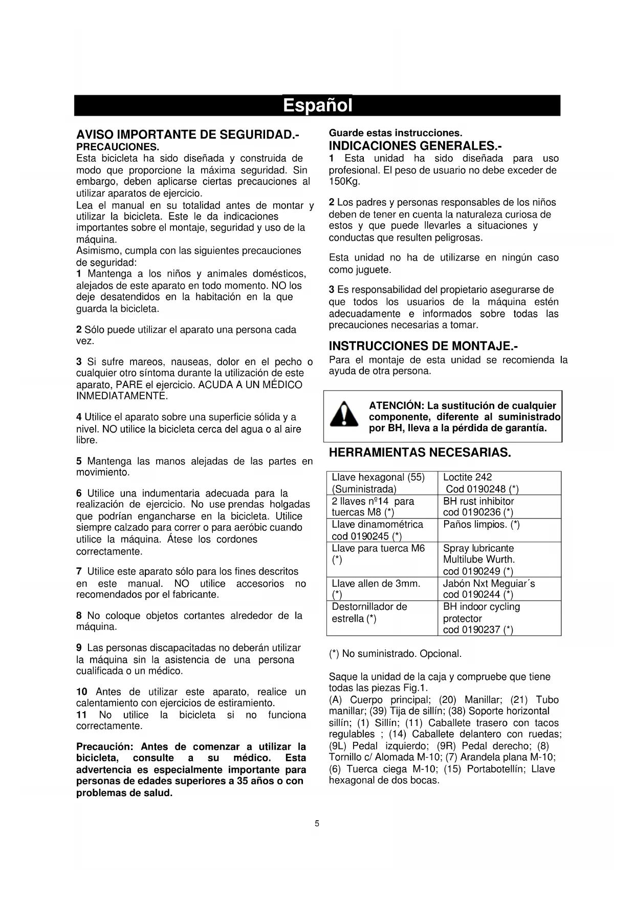 PRECAUCIONES. Esta bicicleta ha sido diseñada y construida de modo que proporcione la máxima seguridad. Sin embargo, deben aplicarse ciertas precauciones al utilizar aparatos de ejercicio. Lea el manual en su totalidad antes de montar y utilizar la bicicleta. Este le da indicaciones importantes sobre el montaje, seguridad y uso de la máquina. Asimismo, cumpla con las siguientes precauciones de seguridad: 1 Mantenga a los niños y animales domésticos, alejados de este aparato en todo momento. NO los deje desatendidos en la habitación en la que guarda la bicicleta. 2 Sólo puede utilizar el aparato una persona cada vez. 3 Si sufre mareos, nauseas, dolor en el pecho o cualquier otro síntoma durante la utilización de este aparato, PARE el ejercicio. ACUDA A UN MÉDICO INMEDIATAMENTE. 4 Utilice el aparato sobre una superficie sólida y a nivel. NO utilice la bicicleta cerca del agua o al aire libre. 5 Mantenga las manos alejadas de las partes en movimiento. 6 Utilice una indumentaria adecuada para la realización de ejercicio. No use prendas holgadas que podrían engancharse en la bicicleta. Utilice siempre calzado para correr o para aeróbic cuando utilice la máquina. Átese los cordones correctamente. 7 Utilice este aparato sólo para los fines descritos en este manual. NO utilice accesorios no recomendados por el fabricante. 8 No coloque objetos cortantes alrededor de la máquina. 9 Las personas discapacitadas no deberán utilizar la máquina sin la asistencia de una persona cualificada o un médico. 10 Antes de utilizar este aparato, realice un calentamiento con ejercicios de estiramiento. 11 No utilice la bicicleta si no funciona correctamente. Precaución: Antes de comenzar a utilizar la bicicleta, consulte a su médico. Esta advertencia es especialmente importante para personas de edades superiores a 35 años o con problemas de salud. Guarde estas instrucciones. INDICACIONES GENERALES.- 1 Esta unidad ha sido diseñada para uso profesional. El peso de usuario no debe exceder de 150Kg. 2 Los padres y personas responsables de los niños deben de tener en cuenta la naturaleza curiosa de estos y que puede llevarles a situaciones y conductas que resulten peligrosas. Esta unidad no ha de utilizarse en ningún caso como juguete. 3 Es responsabilidad del propietario asegurarse de que todos los usuarios de la máquina estén adecuadamente e informados sobre todas las precauciones necesarias a tomar.