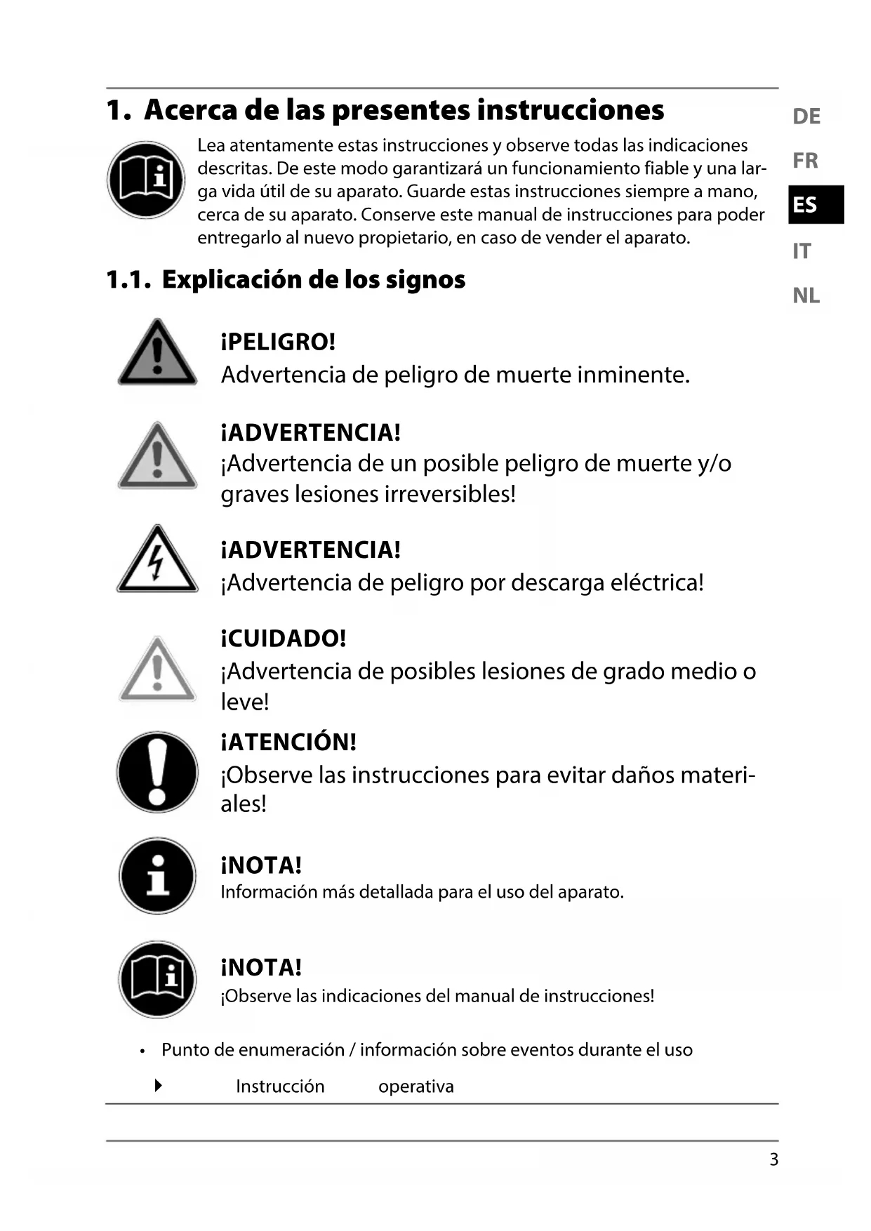 Lea atentamente estas instrucciones y observe todas las indicaciones descritas. De este modo garantizará un funcionamiento fiable y una lar- ga vida útil de su aparato. Guarde estas instrucciones siempre a mano, cerca de su aparato. Conserve este manual de instrucciones para poder entregarlo al nuevo propietario, en caso de vender el aparato. 1.1. Explicación de los signos ¡PELIGRO! Advertencia de peligro de muerte inminente. ¡ADVERTENCIA! ¡Advertencia de un posible peligro de muerte y/o graves lesiones irreversibles! ¡ADVERTENCIA! ¡Advertencia de peligro por descarga eléctrica! ¡CUIDADO! ¡Advertencia de posibles lesiones de grado medio o leve! ¡ATENCIÓN! ¡Observe las instrucciones para evitar daños materi- ales! ¡NOTA! Información más detallada para el uso del aparato. ¡NOTA! ¡Observe las indicaciones del manual de instrucciones!