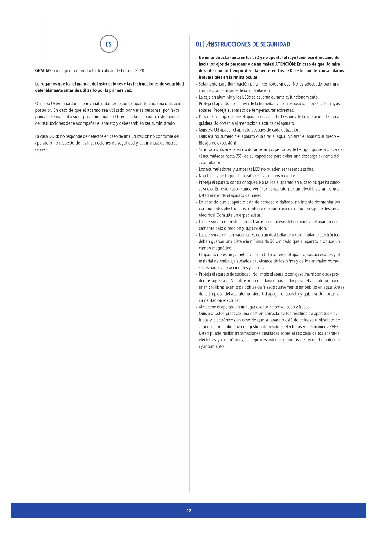 GRACIAS por adquirir un producto de calidad de la casa DÖRR. Le rogamos que lea el manual de instrucciones y las instrucciones de seguridad detenidamente antes de utilizarlo por la primera vez. Quisiera Usted guardar este manual juntamente con el aparato para una utilización posterior. En caso de que el aparato sea utilizado por varias personas, por favor ponga este manual a su disposición. Cuando Usted venda el aparato, este manual de instrucciones debe acompañar el aparato y debe también ser suministrado. La casa DÖRR no responde de defectos en caso de una utilización no conforme del aparato o no respecto de las instrucciones de seguridad y del manual de instruc- ciones