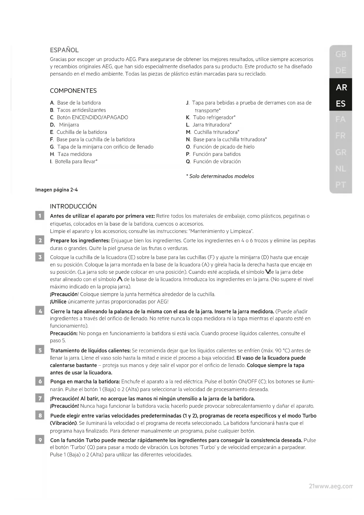 - Solo determinados modelos Imagen página 2-4 INTRODUCCIÓN 1 Antes de utilizar el aparato por primera vez: Retire todos los materiales de embalaje, como plásticos, pegatinas o etiquetas, colocados en la base de la batidora, cuencos o accesorios. Limpie el aparato y los accesorios; consulte las instrucciones: “Mantenimiento y Limpieza”. 2 Prepare los ingredientes: Enjuague bien los ingredientes. Corte los ingredientes en 4 o 6 trozos y elimine las pepitas duras o grandes. Quite la piel gruesa de las frutas o verduras. 3 Coloque la cuchilla de la licuadora (E) sobre la base para las cuchillas (F) y ajuste la minijarra (D) hasta que encaje en su posición. Coloque la jarra montada en la base de la licuadora (A) y gírela hacia la derecha hasta que encaje en su posición. (La jarra solo se puede colocar en una posición). Cuando esté acoplada, el símbolo de la jarra debe estar alineado con el símbolo de la base de la licuadora. Introduzca los ingredientes en la jarra. (No supere el nivel máximo indicado en la propia jarra). ¡Precaución! Coloque siempre la junta hermética alrededor de la cuchilla. ¡Utilice únicamente juntas proporcionadas por AEG! 4 Cierre la tapa alineando la palanca de la misma con el asa de la jarra. Inserte la jarra medidora. (Puede añadir ingredientes a través del oricio de llenado. No retire nunca la copa medidora ni la tapa mientras el aparato esté en funcionamiento). Precaución: No ponga en funcionamiento la batidora si está vacía. Cuando procese líquidos calientes, consulte el paso 5. 5 Tratamiento de líquidos calientes: Se recomienda dejar que los líquidos calientes se enfríen (máx. 90 °C) antes de llenar la jarra. Llene el vaso solo hasta la mitad e inicie el proceso a baja velocidad. El vaso de la licuadora puede calentarse bastante – proteja sus manos y deje salir el vapor por el oricio de llenado. Coloque siempre la tapa antes de usar la licuadora. 6 Ponga en marcha la batidora: Enchufe el aparato a la red eléctrica. Pulse el botón ON/OFF (C); los botones se ilumi- narán. Pulse el botón 1 (Baja) o 2 (Alta) para seleccionar la velocidad de procesamiento deseada. 7 ¡Precaución! Al batir, no acerque las manos ni ningún utensilio a la jarra de la batidora. ¡Precaución! Nunca haga funcionar la batidora vacía; hacerlo puede provocar sobrecalentamiento y dañar el aparato. 8 Puede elegir entre varias velocidades predeterminadas (1 y 2), programas de receta especícos y el modo Turbo (Vibración). Se iluminará la velocidad o el programa de receta seleccionado. La batidora funcionará hasta que el programa haya nalizado. Para detener manualmente un programa, pulse cualquier botón. 9 Con la función Turbo puede mezclar rápidamente los ingredientes para conseguir la consistencia deseada. Pulse el botón ‘Turbo’ (Q) para pasar a modo de vibración. Los botones ‘Turbo’ y de velocidad empezarán a parpadear. Pulse 1 (Baja) o 2 (Alta) para utilizar las diferentes velocidades.22 www.aeg.com aparato.