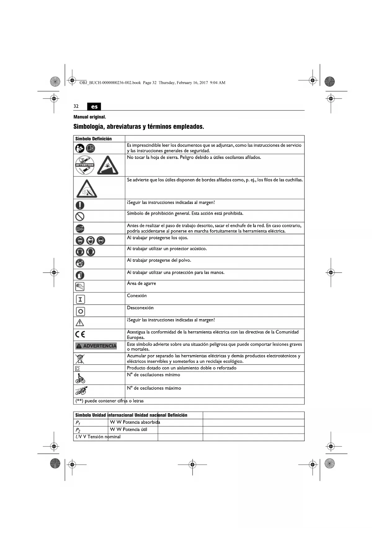 Manual original. Simbología, abreviaturas y términos empleados. Símbolo Definición Es imprescindible leer los documentos que se adjuntan, como las instrucciones de servicio y las instrucciones generales de seguridad. No tocar la hoja de sierra. Peligro debido a útiles oscilantes afilados. Se advierte que los útiles disponen de bordes afilados como, p. ej., los filos de las cuchillas. ¡Seguir las instrucciones indicadas al margen! Símbolo de prohibición general. Esta acción está prohibida. Antes de realizar el paso de trabajo descrito, sacar el enchufe de la red. En caso contrario, podría accidentarse al ponerse en marcha fortuitamente la herramienta eléctrica. Al trabajar protegerse los ojos. Al trabajar utilizar un protector acústico. Al trabajar protegerse del polvo. Al trabajar utilizar una protección para las manos. Área de agarre Conexión Desconexión ¡Seguir las instrucciones indicadas al margen! Atestigua la conformidad de la herramienta eléctrica con las directivas de la Comunidad Europea. Este símbolo advierte sobre una situación peligrosa que puede comportar lesiones graves o mortales. Acumular por separado las herramientas eléctricas y demás productos electrotécnicos y eléctricos inservibles y someterlos a un reciclaje ecológico. Producto dotado con un aislamiento doble o reforzado N° de oscilaciones mínimo N° de oscilaciones máximo (**) puede contener cifras o letras ADVERTENCIA Símbolo Unidad internacional Unidad nacional Definición