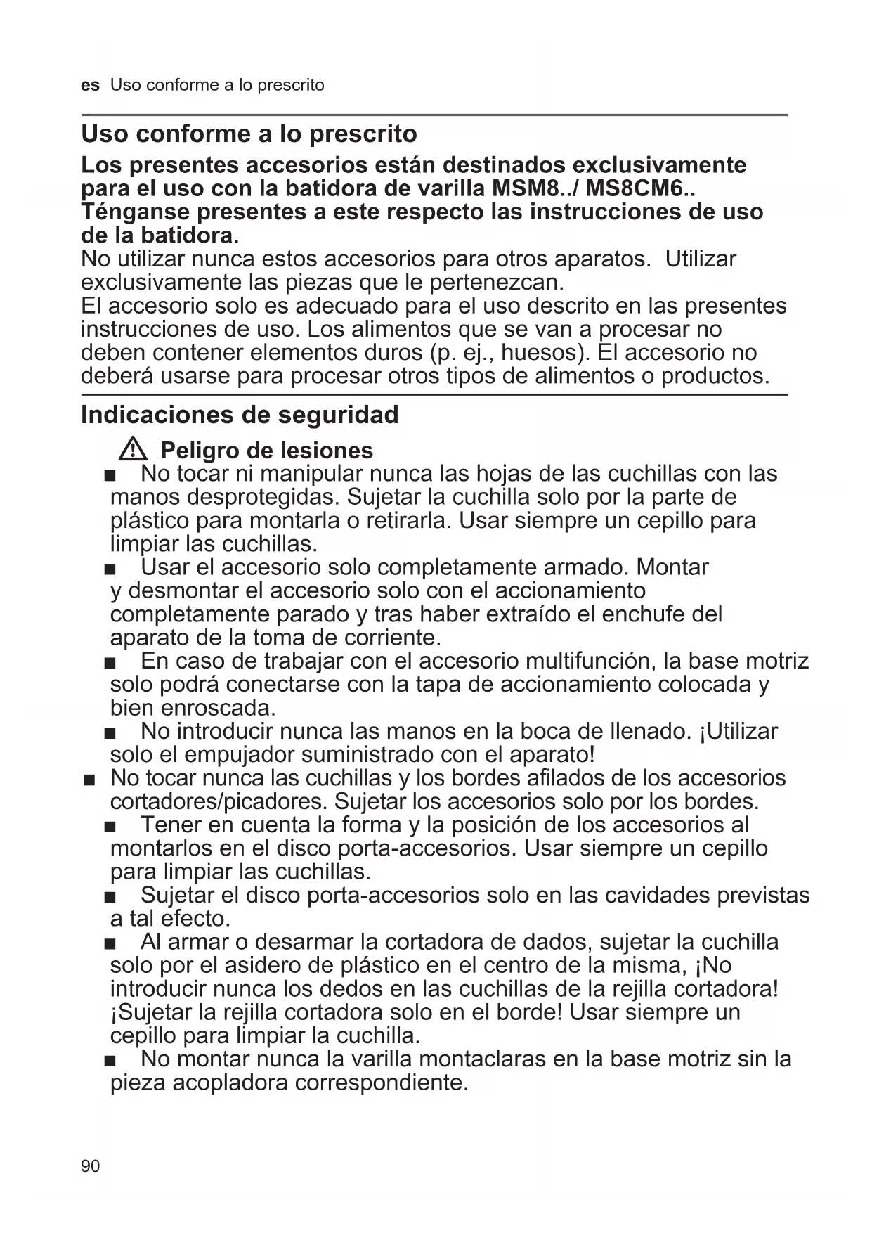 ■ Älä pese kuutioleikkurin osia astianpesukoneessa, terät tylsyvät. Huuhdo kuutioleikkurin kaikki osat juoksevan veden alla. Harjaa osat puhtaaksi. Oikeudet muutoksiin pidätetään.90 es Uso conforme a lo prescrito Uso conforme a lo prescrito Los presentes accesorios están destinados exclusivamente para el uso con la batidora de varilla MSM8../ MS8CM6.. Ténganse presentes a este respecto las instrucciones de uso de la batidora. No utilizar nunca estos accesorios para otros aparatos. Utilizar exclusivamente las piezas que le pertenezcan. El accesorio solo es adecuado para el uso descrito en las presentes instrucciones de uso. Los alimentos que se van a procesar no deben contener elementos duros (p. ej., huesos). El accesorio no deberá usarse para procesar otros tipos de alimentos o productos. Indicaciones de seguridad W Peligro de lesiones ■ No tocar ni manipular nunca las hojas de las cuchillas con las manos desprotegidas. Sujetar la cuchilla solo por la parte de plástico para montarla o retirarla. Usar siempre un cepillo para limpiar las cuchillas. ■ Usar el accesorio solo completamente armado. Montar y desmontar el accesorio solo con el accionamiento completamente parado y tras haber extraído el enchufe del aparato de la toma de corriente. ■ En caso de trabajar con el accesorio multifunción, la base motriz solo podrá conectarse con la tapa de accionamiento colocada y bien enroscada. ■ No introducir nunca las manos en la boca de llenado. ¡Utilizar solo el empujador suministrado con el aparato! ■ No tocar nunca las cuchillas y los bordes afilados de los accesorios cortadores/picadores. Sujetar los accesorios solo por los bordes. ■ Tener en cuenta la forma y la posición de los accesorios al montarlos en el disco porta-accesorios. Usar siempre un cepillo para limpiar las cuchillas. ■ Sujetar el disco porta-accesorios solo en las cavidades previstas a tal efecto. ■ Al armar o desarmar la cortadora de dados, sujetar la cuchilla solo por el asidero de plástico en el centro de la misma, ¡No introducir nunca los dedos en las cuchillas de la rejilla cortadora! ¡Sujetar la rejilla cortadora solo en el borde! Usar siempre un cepillo para limpiar la cuchilla. ■ No montar nunca la varilla montaclaras en la base motriz sin la pieza acopladora correspondiente.91