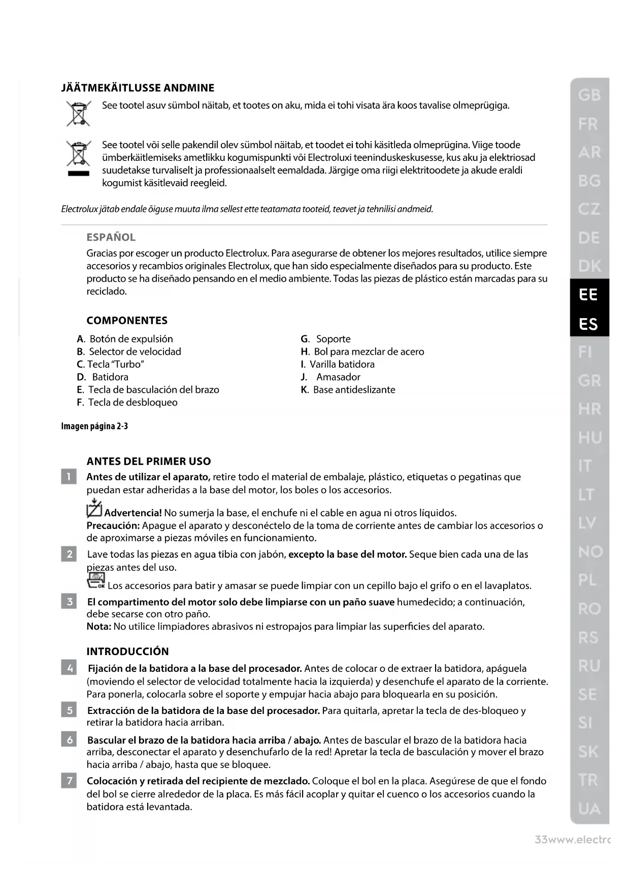 1 Antes de utilizar el aparato, retire todo el material de embalaje, plástico, etiquetas o pegatinas que puedan estar adheridas a la base del motor, los boles o los accesorios. Advertencia! No sumerja la base, el enchufe ni el cable en agua ni otros líquidos. Precaución: Apague el aparato y desconéctelo de la toma de corriente antes de cambiar los accesorios o de aproximarse a piezas móviles en funcionamiento. 2 Lave todas las piezas en agua tibia con jabón, excepto la base del motor. Seque bien cada una de las piezas antes del uso. Los accesorios para batir y amasar se puede limpiar con un cepillo bajo el grifo o en el lavaplatos. 3 El compartimento del motor solo debe limpiarse con un paño suave humedecido; a continuación, debe secarse con otro paño. Nota: No utilice limpiadores abrasivos ni estropajos para limpiar las supercies del aparato. INTRODUCCIÓN 4 Fijación de la batidora a la base del procesador. Antes de colocar o de extraer la batidora, apáguela (moviendo el selector de velocidad totalmente hacia la izquierda) y desenchufe el aparato de la corriente. Para ponerla, colocarla sobre el soporte y empujar hacia abajo para bloquearla en su posición. 5 Extracción de la batidora de la base del procesador. Para quitarla, apretar la tecla de des-bloqueo y retirar la batidora hacia arriban. 6 Bascular el brazo de la batidora hacia arriba / abajo. Antes de bascular el brazo de la batidora hacia arriba, desconectar el aparato y desenchufarlo de la red! Apretar la tecla de basculación y mover el brazo hacia arriba / abajo, hasta que se bloquee. 7 Colocación y retirada del recipiente de mezclado. Coloque el bol en la placa. Asegúrese de que el fondo del bol se cierre alrededor de la placa. Es más fácil acoplar y quitar el cuenco o los accesorios cuando la batidora está levantada.34www.electrolux.com 8 Inserte el accesorio para batir o para amasar en las ranuras para accesorios debajo de la batidora, hasta que encaje. 9 Antes de quitar los accesorios para batir o para amasar, desenchufe la batidora. Después sujete rme- mente con una mano mientras pulsa el botón de expulsar. Nota: Las varillas o los ganchos solo se pueden extraer cuando el selector de velocidad esté colocado totalmente hacia la izquierda.
