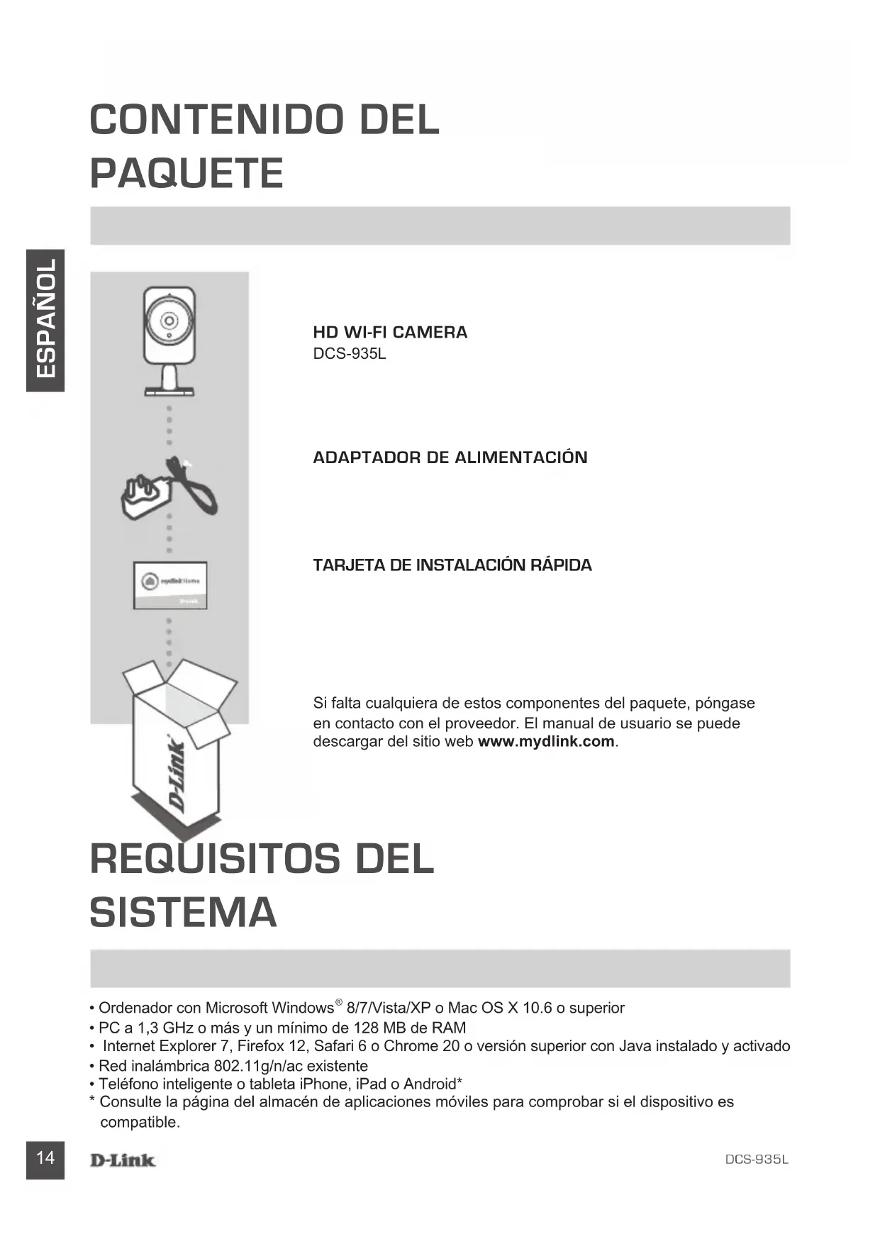 - Consulte la página del almacén de aplicaciones móviles para comprobar si el dispositivo es compatible. CONTENIDO DEL PAQUETE Si falta cualquiera de estos componentes del paquete, póngase en contacto con el proveedor. El manual de usuario se puede descargar del sitio web www.mydlink.com.