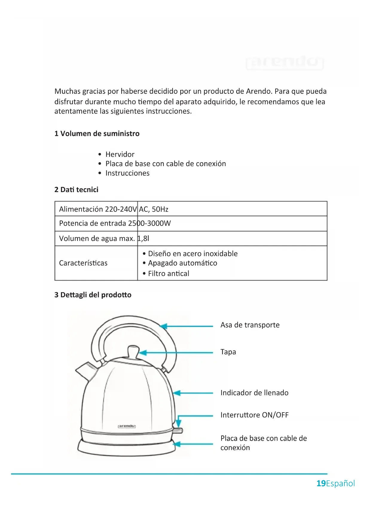 - Instrucciones 2 Da tecnici 3 Deagli del prodoo Alimentación 220-240V AC, 50Hz Potencia de entrada 2500-3000W Volumen de agua max. 1,8l Caracteríscas