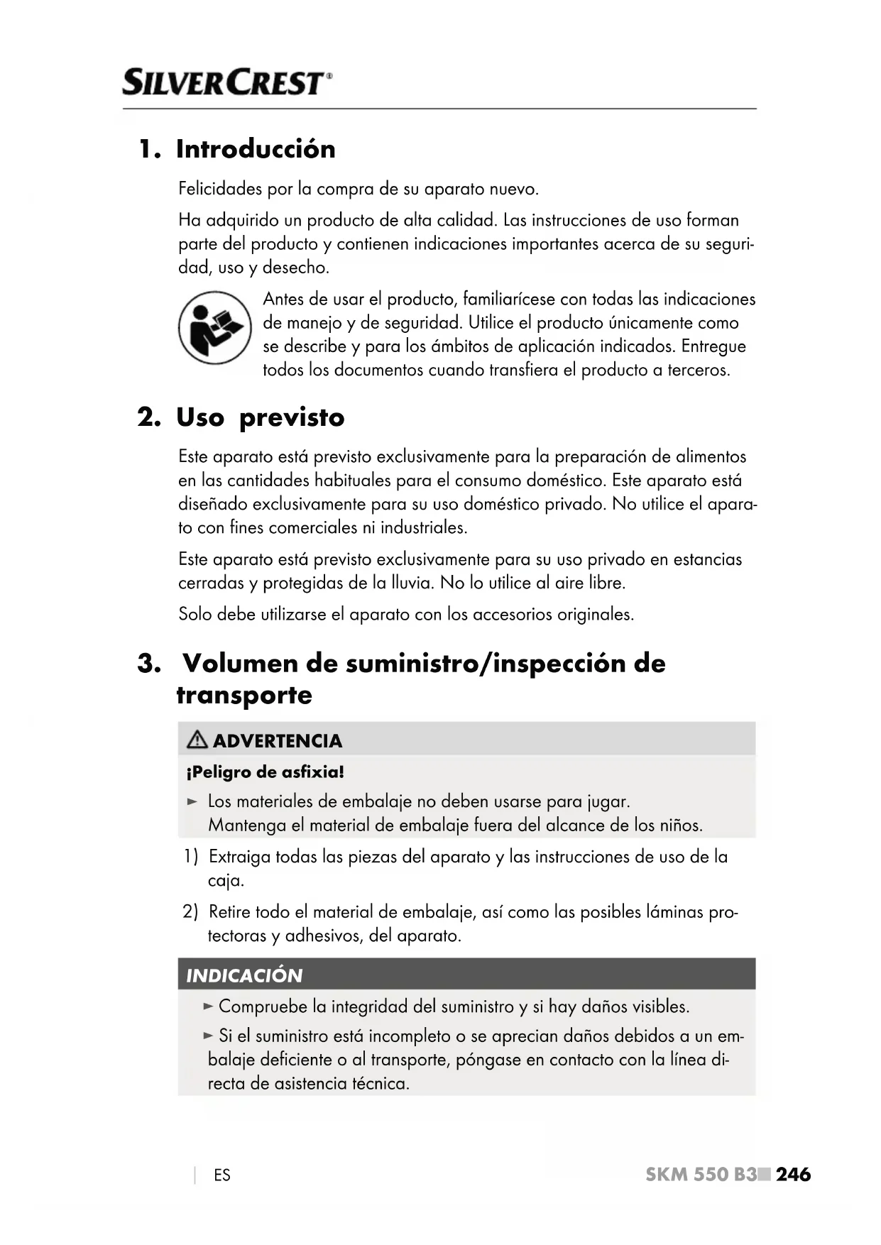 tectoras y adhesivos, del aparato. INDICACIÓN ► Compruebe la integridad del suministro y si hay daños visibles. ► Si el suministro está incompleto o se aprecian daños debidos a un em- balaje deficiente o al transporte, póngase en contacto con la línea di- recta de asistencia técnica.SKM 550 B3 ES