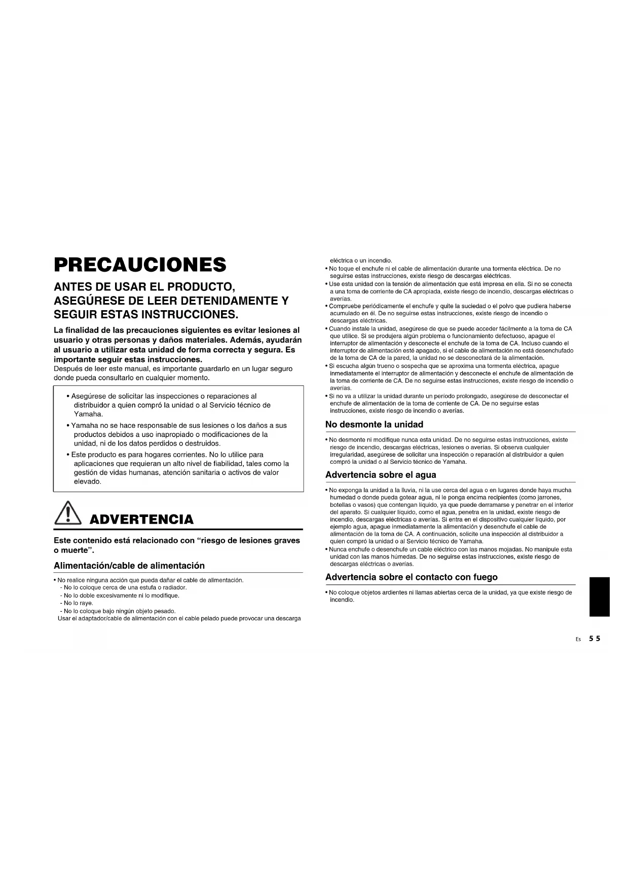 - No exponga la unidad a la lluvia, ni la use cerca del agua o en lugares donde haya mucha humedad o donde pueda gotear agua, ni le ponga encima recipientes (como jarrones, botellas o vasos) que contengan líquido, ya que puede derramarse y penetrar en el interior del aparato. Si cualquier líquido, como el agua, penetra en la unidad, existe riesgo de incendio, descargas eléctricas o averías. Si entra en el dispositivo cualquier líquido, por ejemplo agua, apague inmediatamente la alimentación y desenchufe el cable de alimentación de la toma de CA. A continuación, solicite una inspección al distribuidor a quien compró la unidad o al Servicio técnico de Yamaha.• Nunca enchufe o desenchufe un cable eléctrico con las manos mojadas. No manipule esta unidad con las manos húmedas. De no seguirse estas instrucciones, existe riesgo de descargas eléctricas o averías. Advertencia sobre el contacto con fuego
