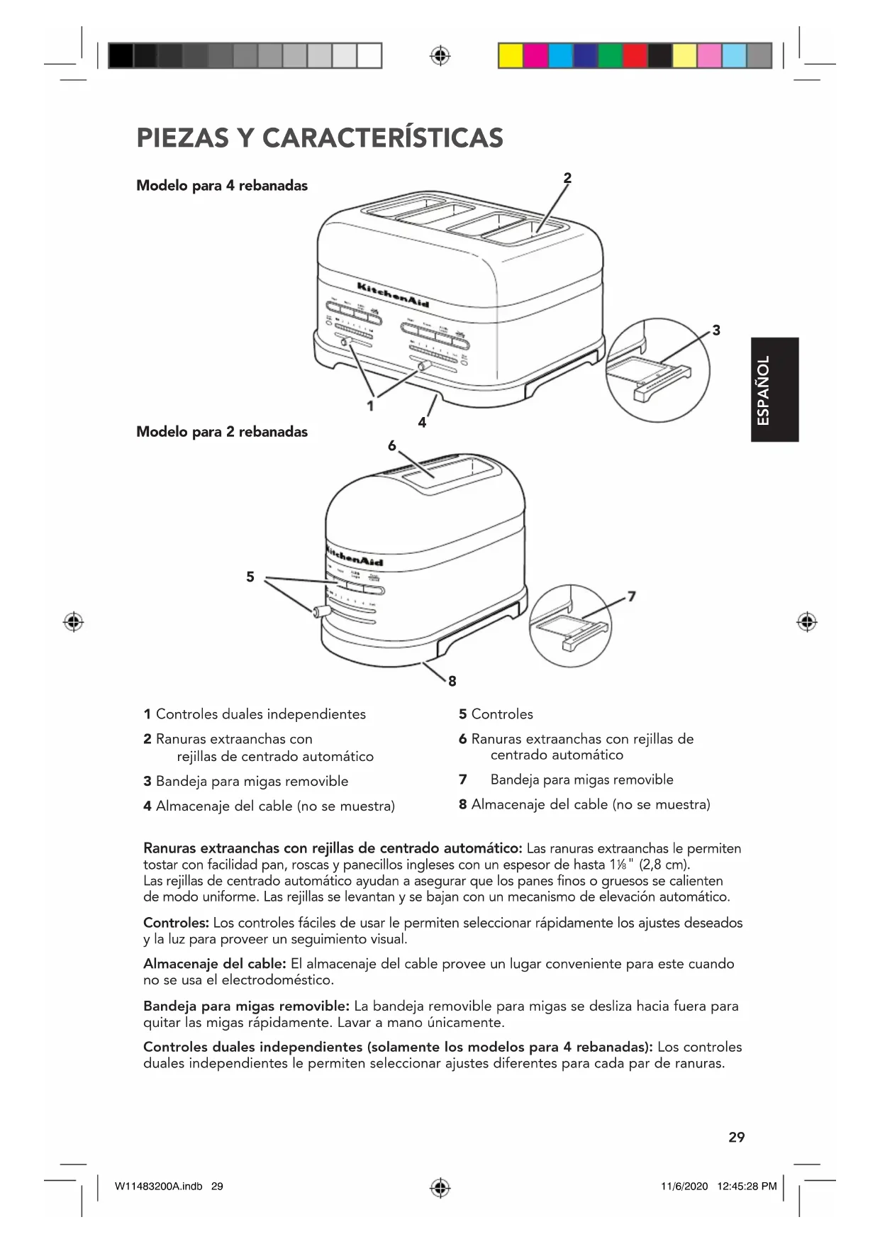" (2,8 cm). Lasrejillas de centrado automático ayudan a asegurar que los panes finos o gruesos se calienten demodo uniforme. Las rejillas se levantan y se bajan con un mecanismo de elevación automático. Controles: Los controles fáciles de usar le permiten seleccionar rápidamente los ajustes deseados y la luz para proveer un seguimiento visual. Almacenaje del cable: El almacenaje del cable provee un lugar conveniente para este cuando no se usa el electrodoméstico. Bandeja para migas removible: La bandeja removible para migas se desliza hacia fuera para quitar las migas rápidamente. Lavar a mano únicamente. Controles duales independientes (solamente los modelos para 4 rebanadas): Los controles duales independientes le permiten seleccionar ajustes diferentes para cada par de ranuras.