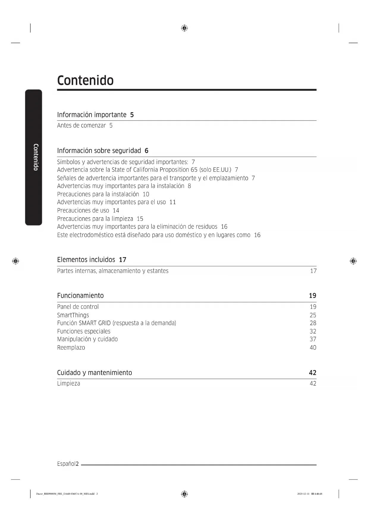 DRZ30990*** / DRZ36980*** Dacor_BRR9000M_FRE_DA68-03607A-08_MES.indd 1 2020-12-11 4:46:48Español2 Contenido Contenido Información importante 5 Antes de comenzar 5 Información sobre seguridad 6 Símbolos y advertencias de seguridad importantes: 7 Advertencia sobre la State of California Proposition 65 (solo EE.UU.) 7 Señales de advertencia importantes para el transporte y el emplazamiento 7 Advertencias muy importantes para la instalación 8 Precauciones para la instalación 10 Advertencias muy importantes para el uso 11 Precauciones de uso 14 Precauciones para la limpieza 15 Advertencias muy importantes para la eliminación de residuos 16 Este electrodoméstico está diseñado para uso doméstico y en lugares como 16 Elementos incluidos 17 Partes internas, almacenamiento y estantes 17 Funcionamiento 19 Panel de control 19 SmartThings 25 Función SMART GRID (respuesta a la demanda) 28 Funciones especiales 32 Manipulación y cuidado 37 Reemplazo 40 Cuidado y mantenimiento 42 Limpieza 42 Dacor_BRR9000M_FRE_DA68-03607A-08_MES.indd 2 2020-12-11 4:46:48Español 3 Contenido Solución de problemas 43 General 43 ¿Se oyen ruidos anómalos procedentes del refrigerador? 46 Apertura automática de la puerta (ADO) 48 SmartThings 49 Smart Grid 50 Garantía y servicio 52 Atención al cliente 52 Garantía 52 Aviso regulatorio 56 Aviso de la FCC (Federal Communications Commission) 56 Aviso de la IC 57 Dacor_BRR9000M_FRE_DA68-03607A-08_MES.indd 3 2020-12-11 4:46:48Español4 Estimado cliente: Felicitaciones por haber adquirido el producto más reciente de Dacor®. Nuestra excepcional combinación de funciones, estilo y rendimiento nos convierte en una excelente incorporación a su hogar. Para familiarizarse con los controles, las funciones y el completo potencial de su nuevo electrodoméstico Dacor, lea detenidamente este manual de uso y cuidado, comenzando por la sección Instrucciones importantes de seguridad. Todos los electrodomésticos Dacor se han diseñado y fabricado con la calidad y el orgullo que determina el marco de valores de nuestra empresa. Si se produjera algún problema con el producto, consulte en primer lugar la sección Solución de problemas de este manual. En ella encontrará sugerencias y soluciones útiles que puede seguir antes de llamar al servicio técnico. La valiosa opinión de los clientes nos ayuda a mejorar constantemente nuestros productos y servicios, y por ello le rogamos que contacte con nuestro Servicio de atención al cliente siempre que necesite asistencia con alguno de sus productos. Dacor Customer Service Team 14425 Clark Avenue City of Industry, CA 91745 Teléfono: (833) 353-5483 Fax: (626) 403-3130 Horario: De lunes a viernes de 5:00 a.m. a 5:00 p.m. Hora del Pacífico Sitio web: www.Dacor.com Gracias por elegir Dacor para su hogar. Somos una empresa formada por familias y para familias, y nuestra misión es servirlas. Estamos seguros de que su nuevo producto Dacor le ofrecerá un alto nivel de rendimiento y disfrute por muchos años. Atentamente, Dacor_BRR9000M_FRE_DA68-03607A-08_MES.indd 4 2020-12-11 4:46:49Español 5 Información importante Información importante Antes de comenzar