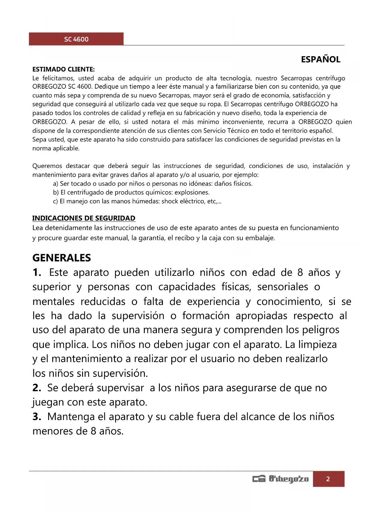 ESPAÑOL ESTIMADO CLIENTE: Le felicitamos, usted acaba de adquirir un producto de alta tecnología, nuestro Secarropas centrífugo ORBEGOZO SC 4600. Dedique un tiempo a leer éste manual y a familiarizarse bien con su contenido, ya que cuanto más sepa y comprenda de su nuevo Secarropas, mayor será el grado de economía, satisfacción y seguridad que conseguirá al utilizarlo cada vez que seque su ropa. El Secarropas centrífugo ORBEGOZO ha pasado todos los controles de calidad y refleja en su fabricación y nuevo diseño, toda la experiencia de ORBEGOZO. A pesar de ello, si usted notara el más mínimo inconveniente, recurra a ORBEGOZO quien dispone de la correspondiente atención de sus clientes con Servicio Técnico en todo el territorio español. Sepa usted, que este aparato ha sido construido para satisfacer las condiciones de seguridad previstas en la norma aplicable. Queremos destacar que deberá seguir las instrucciones de seguridad, condiciones de uso, instalación y mantenimiento para evitar graves daños al aparato y/o al usuario, por ejemplo: a) Ser tocado o usado por niños o personas no idóneas: daños físicos. b) El centrifugado de productos químicos: explosiones. c) El manejo con las manos húmedas: shock eléctrico, etc,...