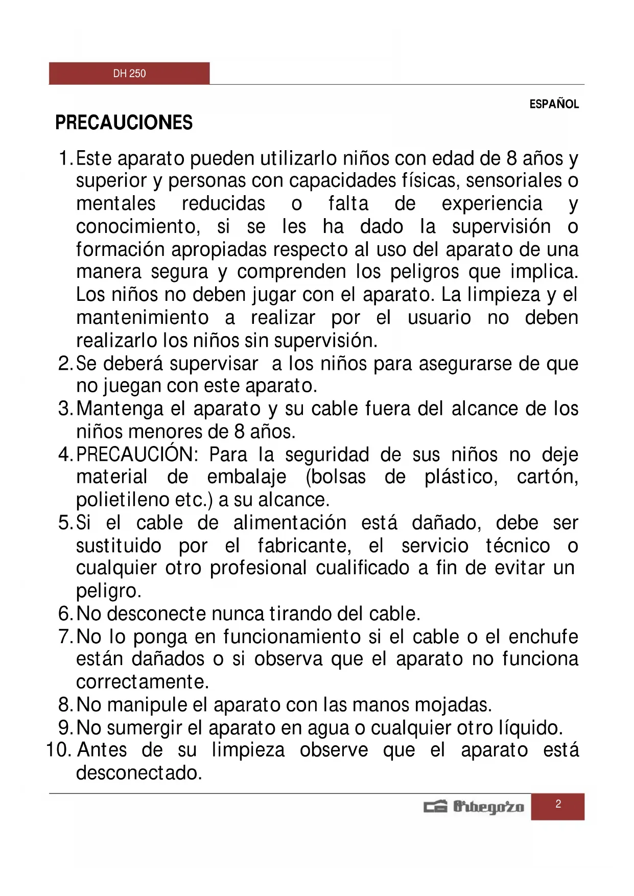 Encuentra gratis el manual del aparato DH 250 Orbegozo en formato PDF.