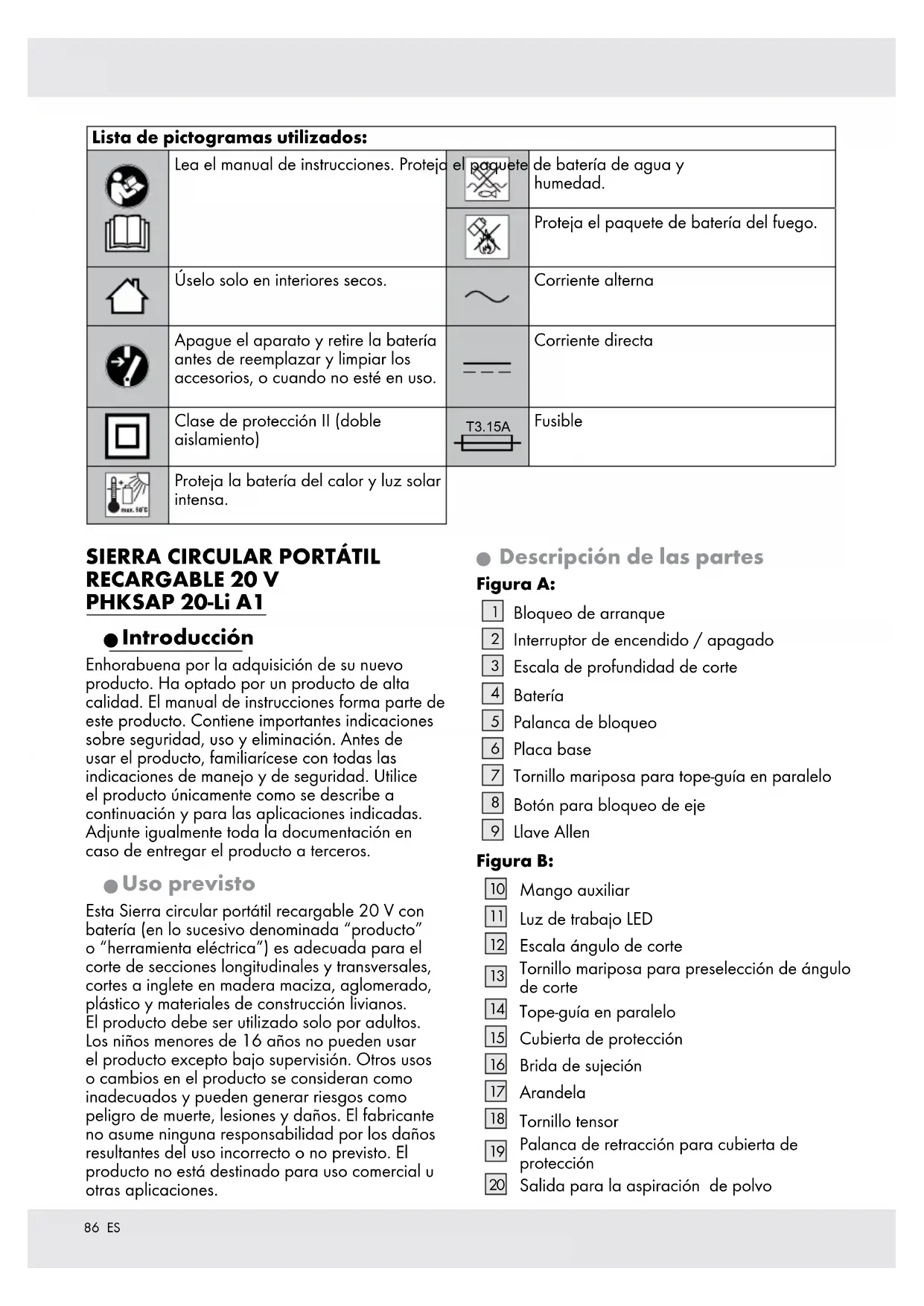 RECARGABLE 20 V PHKSAP 20-Li A1 Q Introducción Enhorabuena por la adquisición de su nuevo producto. Ha optado por un producto de alta calidad. El manual de instrucciones forma parte de este producto. Contiene importantes indicaciones sobre seguridad, uso y eliminación. Antes de usar el producto, familiarícese con todas las indicaciones de manejo y de seguridad. Utilice el producto únicamente como se describe a continuación y para las aplicaciones indicadas. Adjunte igualmente toda la documentación en caso de entregar el producto a terceros. Q Uso previsto Esta Sierra circular portátil recargable 20 V con batería (en lo sucesivo denominada “producto” o “herramienta eléctrica”) es adecuada para el corte de secciones longitudinales y transversales, cortes a inglete en madera maciza, aglomerado, plástico y materiales de construcción livianos. El producto debe ser utilizado solo por adultos. Los niños menores de 16 años no pueden usar el producto excepto bajo supervisión. Otros usos o cambios en el producto se consideran como inadecuados y pueden generar riesgos como peligro de muerte, lesiones y daños. El fabricante no asume ninguna responsabilidad por los daños resultantes del uso incorrecto o no previsto. El producto no está destinado para uso comercial u otras aplicaciones. Lista de pictogramas utilizados: Lea el manual de instrucciones. Proteja el paquete de batería de agua y humedad. Proteja el paquete de batería del fuego. Úselo solo en interiores secos. Corriente alterna Apague el aparato y retire la batería antes de reemplazar y limpiar los accesorios, o cuando no esté en uso. Corriente directa Clase de protección II (doble aislamiento) T3.15A Fusible Proteja la batería del calor y luz solar intensa.87 ES Figura C: