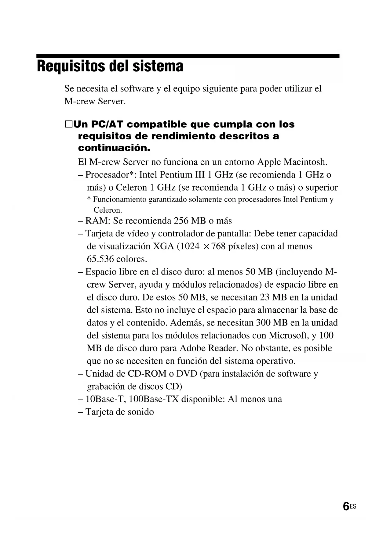 Al menos 50 MB (incluyendo M-crew Server,ridge y nodulos relacionados) de空間 libre en el disco duro. De these 50MB , se necesitan 23MB en la unidad del systema. Esto no incluye el空間 para almacenar la base de datos y el contenido. Además, se necesitan 300MB en la unidad del systema para los nodulos relacionados con Microsoft, y 100MB de disco duro para Adobe Reader. No obstarve, es possible que no se necesiten en función del systema operativo. Si su ordinador no tiene空間 suficiente, es possible que no pueda realizarse la instalación.