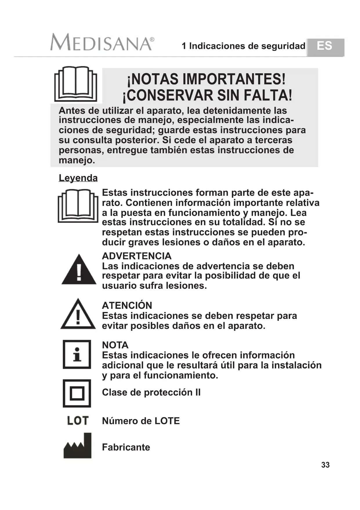indiretti causati dall’apparecchio anche se il danno all’apparecchio viene riconosciuto come caso di garanzia. L’indirizzo del servizio di assistenza è riportato nel foglio allegato separato. MEDISANA GmbH Jagenbergstraße 19 41468 NEUSS Germania eMail: info@medisana.de Internet: www.medisana.deES 1 Indicaciones de seguridad ¡NOTAS IMPORTANTES! ¡CONSERVAR SIN FALTA! Estas instrucciones forman parte de este apa- rato. Contienen información importante relativa a la puesta en funcionamiento y manejo. Lea estas instrucciones en su totalidad. Si no se respetan estas instrucciones se pueden pro- ducir graves lesiones o daños en el aparato. ADVERTENCIA Las indicaciones de advertencia se deben respetar para evitar la posibilidad de que el usuario sufra lesiones. ATENCIÓN Estas indicaciones se deben respetar para evitar posibles daños en el aparato. NOTA Estas indicaciones le ofrecen información adicional que le resultará útil para la instalación y para el funcionamiento. Clase de protección II Leyenda Número de LOTE Fabricante Antes de utilizar el aparato, lea detenidamente las instrucciones de manejo, especialmente las indica- ciones de seguridad; guarde estas instrucciones para su consulta posterior. Si cede el aparato a terceras personas, entregue también estas instrucciones de manejo. 33• Antes de conectar el aparato a la red de suministro, compru- ebe que la tensión indicada en la placa de características se corresponda con la tensión de su red de suministro. Mantenga el cable y el aparato alejado de fuentes de calor, superficies calientes, humedad y líquidos. No toque nunca el enchufe ni el interruptor con las manos húmedas o mojadas o si se encuentra en contacto con el agua. Si el aparato se ha caído al agua, no intente sacarlo sin haberlo desenchufado antes. Conecte la unidad de manera que se pueda acceder fácilmente al enchufe. Una vez utilizado el aparato, desconéctelo inmediatamente con las teclas del mando y desenchufe el cable de alimentación de la toma de corriente. Para desconectar el aparato de la red, no tire nunca del cable de alimentación, sino que ¡tire siempre del enchufe macho! No sujete el aparato por el cable ni retuerza o tire del mismo. Para evitar riesgos, si el cable de red está dañado, solamente puede ser sustituido por MEDISANA, un distribuidor autorizado o por una persona convenientemente cualificada. Observar que el cable no provoque tropiezos. No hay que doblarlo, aprisionarlo ni retorcerlo.