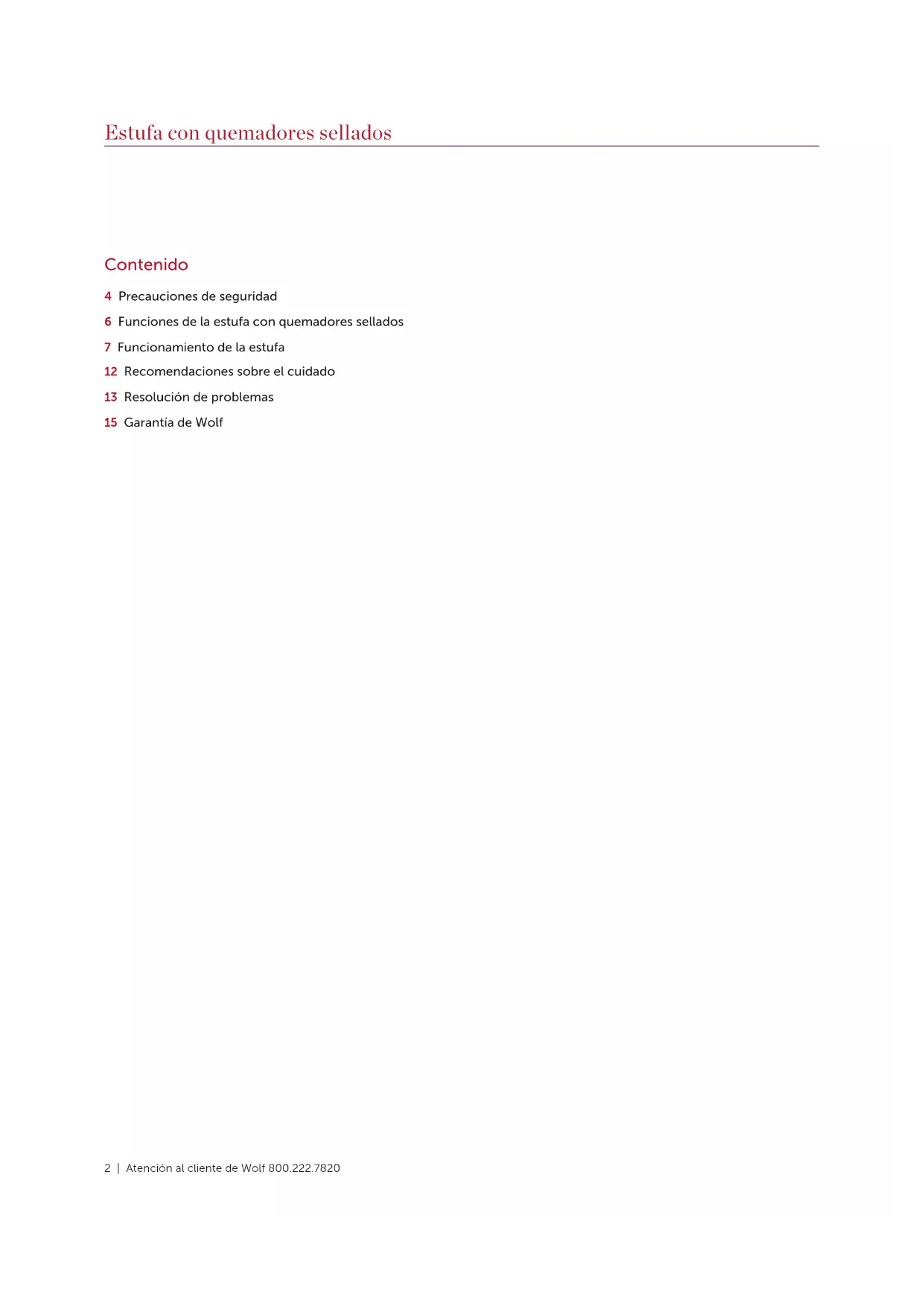La rejilla del quemador de wok permite que el wok fun- cione como un quemador de superficie grande para ollas de fondo plano de hasta 14" (356) de diámetro. Rejilla de quemador de wok Funcionamiento de la estufa12 | Atención al cliente de Wolf 800.222.7820 Recomendaciones sobre el cuidado Recomendaciones sobre el cuidado LIMPIEZA Acero inoxidable Use un limpiador no abrasivo para acero inoxidable y aplique con un paño suave sin pelusa. Para resaltar el lustre natural, limpie suavemente la superficie con una tela de microfibra humedecida con agua, seguida con una gamuza para pulir en seco. Siempre siga la dirección del acabado del acero inoxidable. Parrillas del quemador Retire y coloque sobre una superficie plana cerca del fregadero. Límpielas con agua caliente y un detergente suave o con pasta de bicarbonato de sodio y agua. No las sumerja en agua. Seque con una toalla. Bandeja del quemador Retire los desechos de la superficie antes de limpiarla para agilizar el proceso de limpieza y disminuir las posibi- lidades de rayar la superficie. Utilizando limpiadores ligeramente abrasivos o desengrasantes en aerosol, limpie y enjuague la superficie y séquela de inmediato para evitar que se raye. Utilice vinagre blanco y agua para limpiar las manchas ocasionadas por el agua con alto contenido de minerales. Enjuague y seque de inmediato. Quemadores superiores Deje enfriar. Límpielos con detergente suave o desengrasante en aerosol. Enjuague con agua y séquelos con una toalla. Parrilla Una vez que termine de cocinar, deje encendida la parrilla durante 10 minutos. El fuego alto ayudará a quemar el exceso de partículas de alimentos. Una vez que la rejilla se enfríe, retírela y colóquela en el fregadero. Cúbrala con toallas de cocina húmedas y vierta agua sobre ella para aflojar los residuos. Limpie con jabón y una almohadilla abrasiva. Enjuague y seque. Para limpiar el marco, retírelo y colóquelo en el fregadero. Remójelo en agua caliente y detergente suave. Lávelo y frótelo con una almohadilla abrasiva. Plancha Raspe la grasa en la bandeja de recolección de grasa después de cada uso. Cuando la superficie se haya enfriado, límpiela con papel absorbente para retirar el exceso de grasa o aceite. Después de cada uso, vuelva a aplicar una pequeña cantidad de aceite de maní o vegetal en una toalla de papel y extienda uniformemente. De vez en cuando, retire la preparación. Vierta ⁄ taza (120 ml) de agua tibia y 1 cucharadita (5 ml) de limpiador para plancha sobre la plancha y raspe la grasa en la bandeja de recolección de grasa, y después vacíela. Una vez que esté seca, vuelva a aplicar una pequeña cantidad de aceite para prepararla. Encimera francesa Limpie toda la superficie después de cada uso cuando aún esté ligeramente caliente. Limpie con detergente suave y agua. Enjuague y seque. Después de cada uso, vuelva a aplicar una pequeña cantidad de aceite de maní o vegetal en una toalla de papel y extienda uniformemente. De vez en cuando, retire la preparación. Aplique una pequeña cantidad de vinagre blanco y agua a la superficie cuando aún se encuentre ligeramente caliente. Frote y repita hasta que haya retirado todo el exceso de aceite. Vuelva a aplicar una pequeña cantidad de aceite para prepararla. Anillo de wok Limpie con agua caliente y un detergente suave o una pasta de bicarbonato de sodio y agua. Seque la toalla. Perillas de control Anillos Utilizando un paño húmedo, límpielos con detergente suave o desengrasante en aerosol; enjuague y deje secar. No los coloque en el lavavajillas.wolfappliance.com | 13 Resolución de problemas Resolución de problemas Antes de ponerse en contacto con el servicio certificado de Wolf Factory, visite subzero-wolf.com/assistance o utilice estos consejos útiles para evitar la necesidad de una visita de servicio. La estufa no funciona. 1 Verifique que la energía esté encendida. 2 Verifique que se suministre energía eléctrica a la estufa y que el disyuntor doméstico esté encendido. 3 Apague la unidad en el disyuntor o la fuente de sumin- istro eléctrico durante 30 segundos, luego encienda la unidad. 4 Verifique que la válvula de cierre del suministro de gas esté abierta posición. 5 Comuníquese con el servicio certificado de Wolf Factory. No intente reparar la estufa. Wolf no se hace responsable del servicio necesario para corregir una instalación defectuosa. La bandeja del quemador está dispareja. 1 Verifique que el producto esté colocado sobre una plataforma nivelada y empujado hasta el fondo de la abertura. 2 Confirme que la rejilla del quemador esté nivelada sobre la bandeja del quemador. 3 Comuníquese con el servicio certificado de Wolf Factory. Flama errática, encendido inadecuado o no enciende. 1 Compruebe que las tapas de los quemadores estén colocadas correctamente. 2 Limpie bien el quemador y el piloto. 3 Si se derramó agua recientemente, deje que el área seque por completo. Utilice una secadora de cabello si así lo desea. 4 Si la tapa del quemador se asegura a la cabeza del quemador, compruebe que esté bien sujeta. 5 Empuje la perilla hacia adentro, luego suéltela. Com- pruebe que la perilla regrese a su posición original. La parrilla hace clic continuamente. 1 Compruebe que la perilla se encuentre completamente en Hi (alto). La luz indicadora de la plancha parpadea. 1 Apague la perilla y luego vuelva a encenderla. La llama se apagó y la unidad entró en modo de bloqueo de seguridad.14 | Atención al cliente de Wolf 800.222.7820 Sub-Zero, Sub-Zero & Design, Sub-Zero & Snowflake Design, Dual Refrigeration, The Living Kitchen, Great American Kitchens The Fine Art of Kitchen Design, Wolf, Wolf & Design, Wolf Gourmet, W & Design, perillas de color rojo, Cove, and Cove & Design son marcas registradas y marcas de servicio de Sub-Zero Group, Inc. y sus asociados. Todas las demás marcas registradas son propiedad de sus dueños respectivos en los Estados Unidos y otros países. Resolución de pro