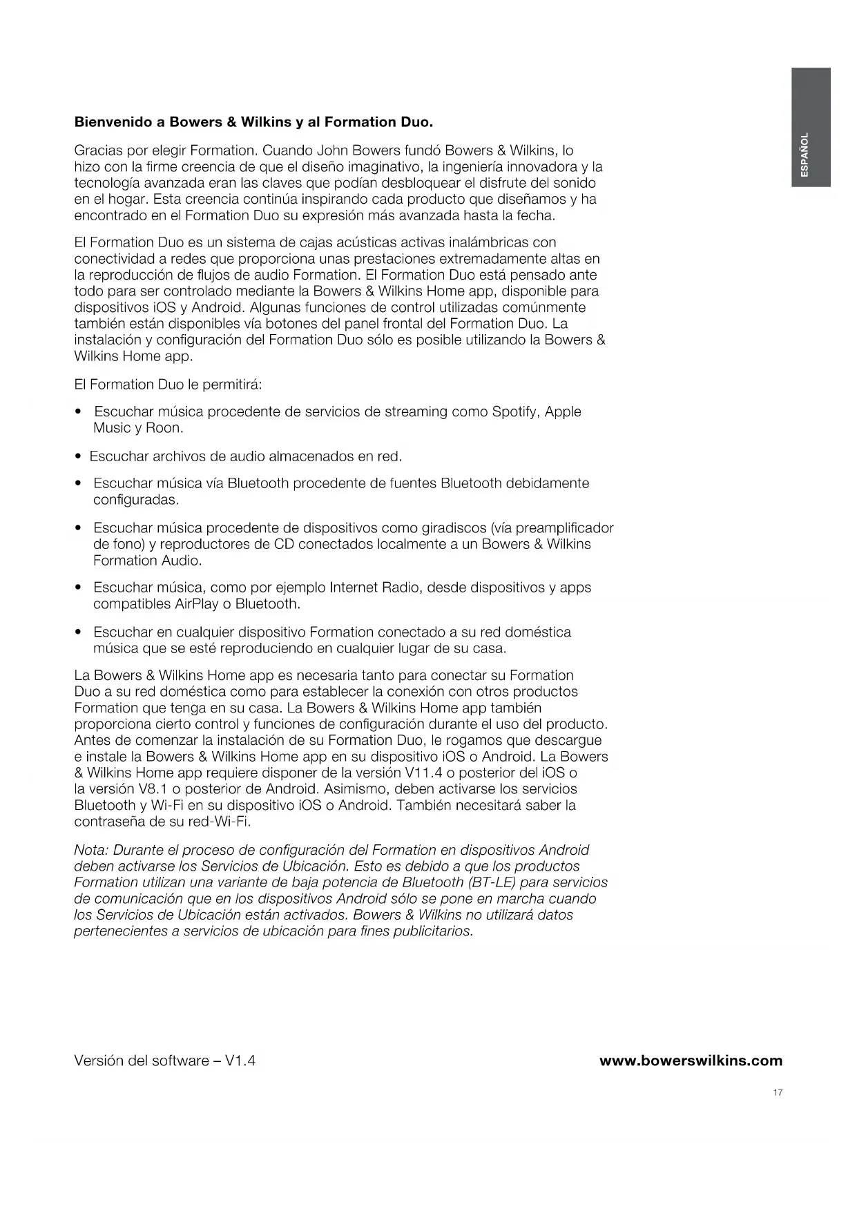 - Escuchar en cualquier dispositivo Formation conectado a su red doméstica música que se esté reproduciendo en cualquier lugar de su casa. La Bowers & Wilkins Home app es necesaria tanto para conectar su Formation Duo a su red doméstica como para establecer la conexión con otros productos Formation que tenga en su casa. La Bowers & Wilkins Home app también proporciona cierto control y funciones de conguración durante el uso del producto. Antes de comenzar la instalación de su Formation Duo, le rogamos que descargue e instale la Bowers & Wilkins Home app en su dispositivo iOS o Android. La Bowers & Wilkins Home app requiere disponer de la versión V11.4 o posterior del iOS o la versión V8.1 o posterior de Android. Asimismo, deben activarse los servicios Bluetooth y Wi-Fi en su dispositivo iOS o Android. También necesitará saber la contraseña de su red-Wi-Fi. Nota: Durante el proceso de conguración del Formation en dispositivos Android deben activarse los Servicios de Ubicación. Esto es debido a que los productos Formation utilizan una variante de baja potencia de Bluetooth (BT-LE) para servicios de comunicación que en los dispositivos Android sólo se pone en marcha cuando los Servicios de Ubicación están activados. Bowers & Wilkins no utilizará datos pertenecientes a servicios de ubicación para nes publicitarios. Versión del software – V1.4 ESPAÑOL Contents ESPAÑOL 1