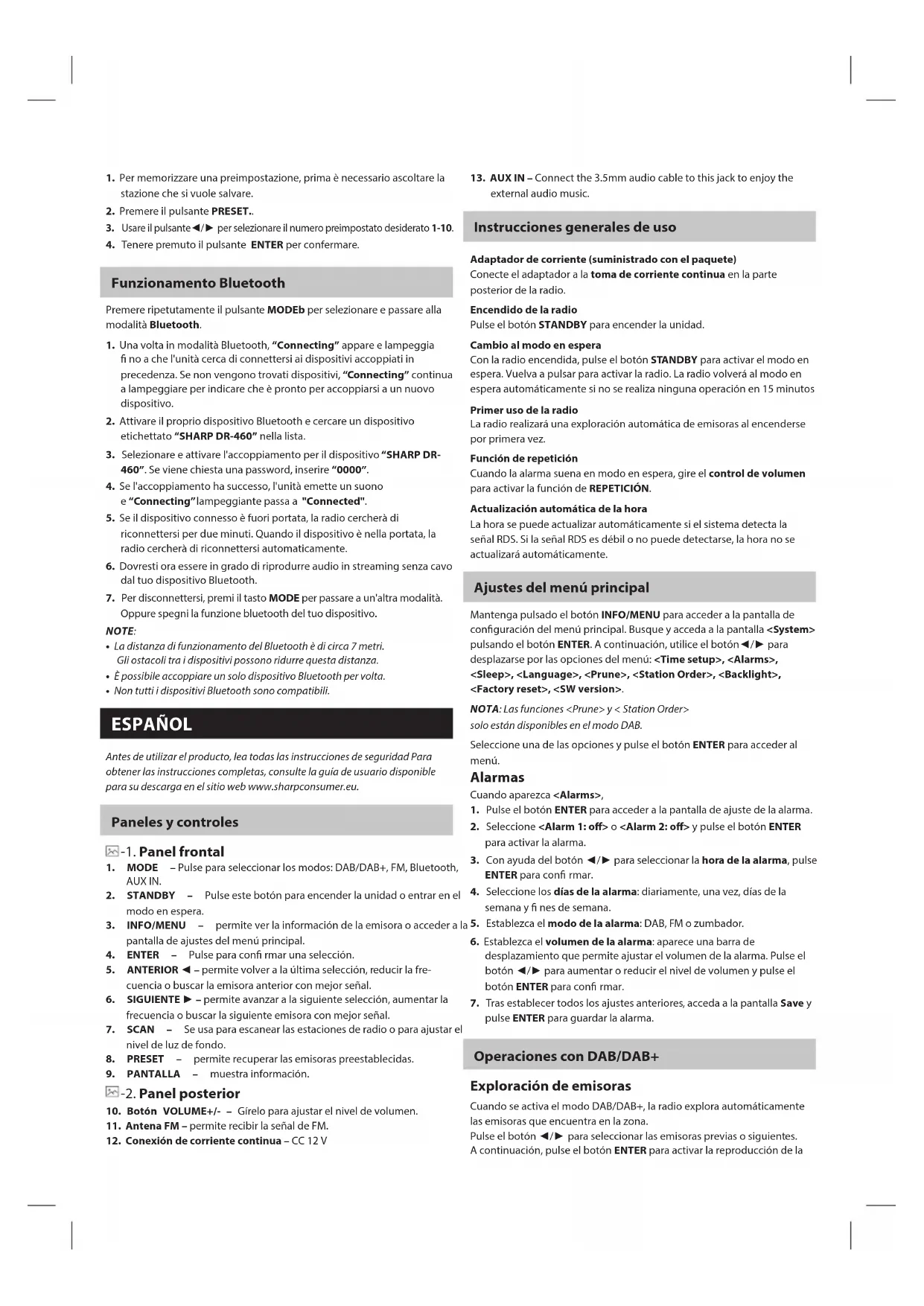 - Non tutti i dispositivi Bluetooth sono compatibili. ESPAÑOL Antes de utilizar el producto, lea todas las instrucciones de seguridad Para obtener las instrucciones completas, consulte la guía de usuario disponible para su descarga en el sitio web www.sharpconsumer.eu. Paneles y controles -1. Panel frontal