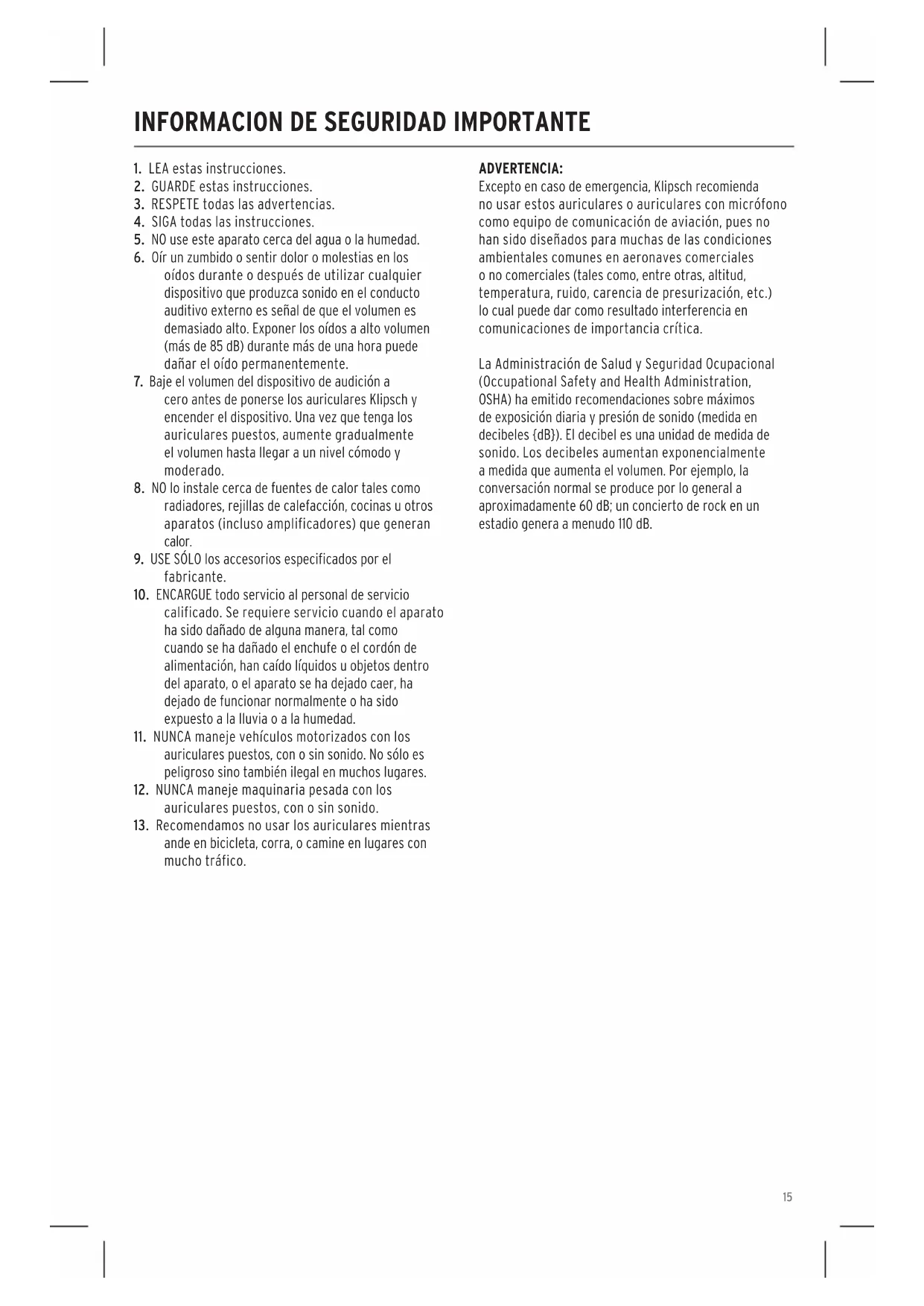 ande en bicicleta, corra, o camine en lugares con mucho tráfico. ADVERTENCIA: Excepto en caso de emergencia, Klipsch recomienda no usar estos auriculares o auriculares con micrófono como equipo de comunicación de aviación, pues no han sido diseñados para muchas de las condiciones ambientales comunes en aeronaves comerciales o no comerciales (tales como, entre otras, altitud, temperatura, ruido, carencia de presurización, etc.) lo cual puede dar como resultado interferencia en comunicaciones de importancia crítica. La Administración de Salud y Seguridad Ocupacional (Occupational Safety and Health Administration, OSHA) ha emitido recomendaciones sobre máximos de exposición diaria y presión de sonido (medida en decibeles {dB}). El decibel es una unidad de medida de sonido. Los decibeles aumentan exponencialmente a medida que aumenta el volumen. Por ejemplo, la conversación normal se produce por lo general a aproximadamente 60 dB; un concierto de rock en un estadio genera a menudo 110 dB.16 Presión de sonido Exposición diaria máxima recomendada 90dB 8 Horas 92dB 6 Horas 95dB 4 Horas 97dB 3 Horas 100dB 2 Horas 102dB 1.5 Horas 105dB 1 Horas 110dB 30 Minutos 115dB 15 Minutos o menos 120dB Evítela, pues puede hacer daño PAUTAS DE LA OSHA SOBRE LÍMITES DE EXPOSICIÓN AL RUIDO17 INFORMACIÓN DE CONFORMIDAD EN LA UNIÓN EUROPEA (EUROPEAN UNION, EU) Tiene derecho a llevar la marca CE; satisface la directiva de bajo voltaje 2006/95/EC de la Unión Europea; la directiva de EMC 2014/53/EU de la Unión Europea; la directiva de Restricción de Sustancias Peligrosas (Restriction of Hazardous Substances, RoHS) 2011/65/EU de la Unión Europea; la directiva de Desechos de Equipo Eléctrico y Electrónico (DEEE) (Waste Electrical and Electronic Equipment, WEEE) 2002/96/EC de la Unión Europea y la directiva de Registro, Evaluación y Autorización de Sustancias y Preparados Químicos (Registration, Evaluation and Authorization of Chemicals, REACH) 1907/2006 de la Unión Europea. Este producto contiene pilas cubiertas por la directiva 2006/66/EC de la Unión Europea, que estipula que no se pueden desechar con los desperdicios domésticos normales. Siga los reglamentos locales. Puede obtener una copia gratis de la Declaración de conformidad comunicándose con el minorista, el distribuidor o las oficinas centrales mundiales de Klipsch Group, Inc. La información de contacto se encuentra en: http://www.klipsch. com/Contact-Us
