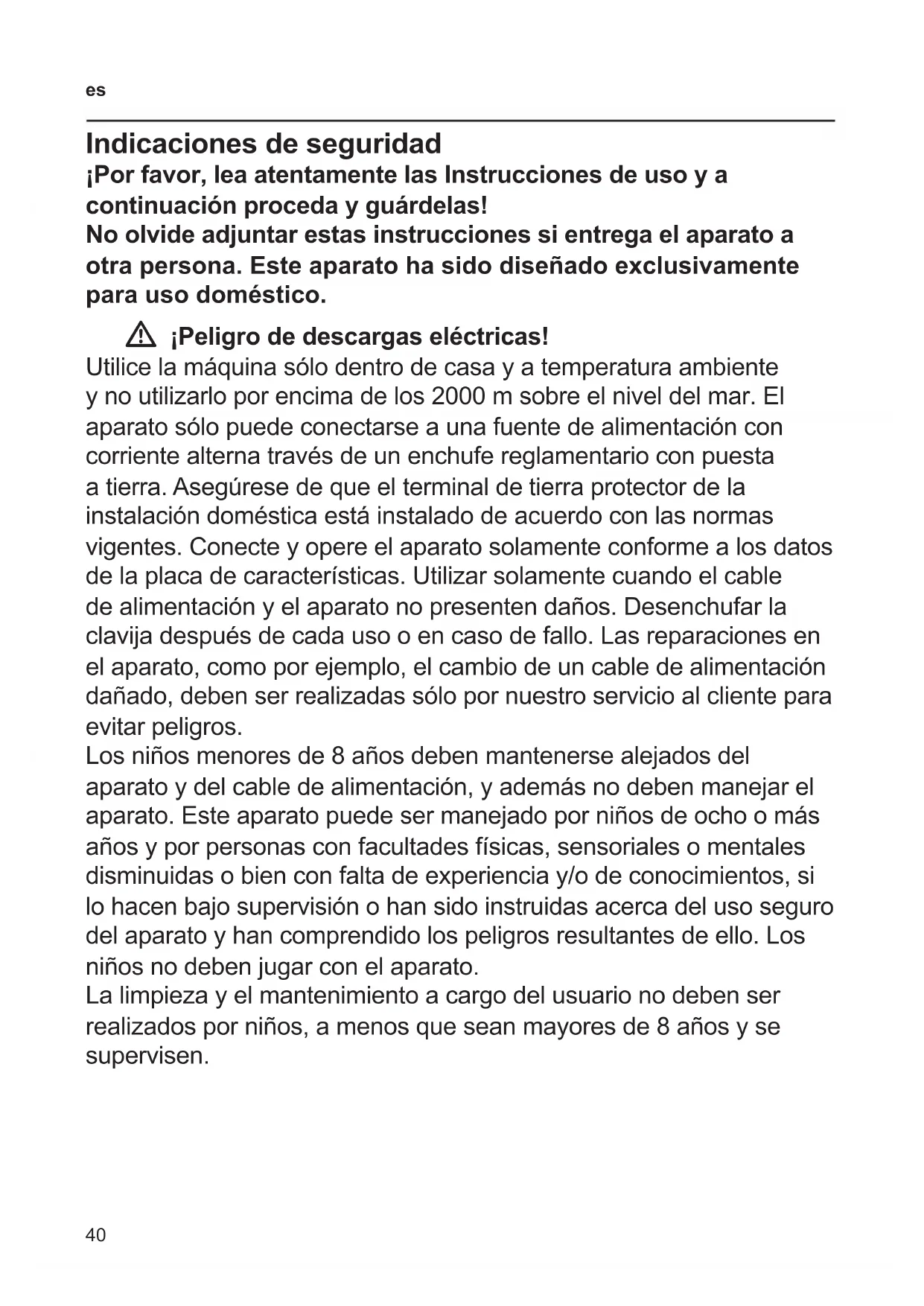 Indicaciones de seguridad ¡Por favor, lea atentamente las Instrucciones de uso y a continuación proceda y guárdelas! No olvide adjuntar estas instrucciones si entrega el aparato a otra persona. Este aparato ha sido diseñado exclusivamente para uso doméstico. W ¡Peligro de descargas eléctricas! Utilice la máquina sólo dentro de casa y a temperatura ambiente y no utilizarlo por encima de los 2000 m sobre el nivel del mar. El aparato sólo puede conectarse a una fuente de alimentación con corriente alterna través de un enchufe reglamentario con puesta a tierra. Asegúrese de que el terminal de tierra protector de la instalación doméstica está instalado de acuerdo con las normas vigentes. Conecte y opere el aparato solamente conforme a los datos de la placa de características. Utilizar solamente cuando el cable de alimentación y el aparato no presenten daños. Desenchufar la clavija después de cada uso o en caso de fallo. Las reparaciones en el aparato, como por ejemplo, el cambio de un cable de alimentación dañado, deben ser realizadas sólo por nuestro servicio al cliente para evitar peligros. Los niños menores de 8 años deben mantenerse alejados del aparato y del cable de alimentación, y además no deben manejar el aparato. Este aparato puede ser manejado por niños de ocho o más años y por personas con facultades físicas, sensoriales o mentales disminuidas o bien con falta de experiencia y/o de conocimientos, si lo hacen bajo supervisión o han sido instruidas acerca del uso seguro del aparato y han comprendido los peligros resultantes de ello. Los niños no deben jugar con el aparato. La limpieza y el mantenimiento a cargo del usuario no deben ser realizados por niños, a menos que sean mayores de 8 años y se supervisen.41