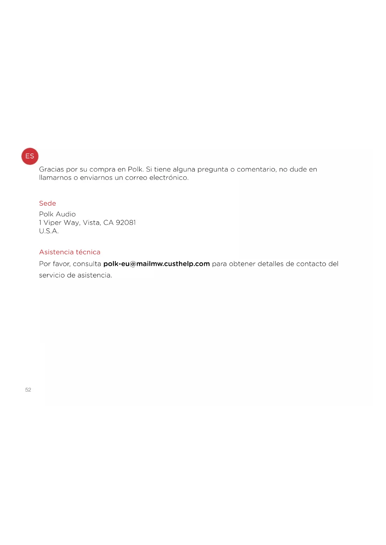 Silenciar Reproducir/Pausar Modo deportes Bluetooth® VoiceAdjust Arriba/abajo Botón de acción Presione para bajar el volumen y usar los Servicios de voz de Alexa Modo nocturno Entradas HDMI Atrás Bajo Arriba/abajo Entrada de TV HDMI-ARC/Óptico Modo película Adelante Volumen principal Arriba/abajo Modo música Mando a distancia60 Modos de sonido Modo deportes Mejora el contenido rico en diálogo, como eventos deportivos, telenoticias y programas de entrevistas. Utiliza Voice Adjust para aumentar la claridad del diálogo y optimiza los niveles de volumen del subwoofer. Modo nocturno Reduce la dinámica de graves y volumen al tiempo que mejora la inteligibilidad de la voz para sonido a bajo volumen. Modo Película Optimizado acústicamente para El modo de sonido predeterminado está diseñado para mejorar tanto el contenido cinematográfico como el de televisión. También proporciona un refuerzo de graves, aumento de espacialización y mejora los niveles de Voice Adjust para mejorar la claridad del diálogo. Es el modo de sonido por defecto para las fuentes HDMI y de entrada óptica. Modo de música El modo de música le brinda un sonido equilibrado y un bajo más suave a la vez que minimiza los efectos de espacialización para garantizar una reproducción de sonido más natural. Todo el modo estéreo proporciona un sonido nítido al reflejar los canales frontales izquierdo y derecho a los altavoces envolventes izquierdo y derecho. Use el botón Música para alternar entre el modo Música y el modo Todo estéreo cuando escuche dos canales de audio.61 Optimización de su experiencia de audio Ajuste del diálogo o canal central Utilice la función de Ajustar voz de Polk para ajustar los niveles de diálogo y mejorar así la claridad al ver programas de televisión, películas y deportes. Sobre la tecnología Polk VoiceAdjust® incorporada La Barra de comandos presenta niveles de voz personalizables en la barra de sonido, que le permite adaptar su experiencia auditiva, ya sea para reproducir un diálogo claro, nítido y nunca perder una sola palabra de su película favorita, programa de televisión o evento deportivo. Ajuste del bajo Facilidad para ajustar el volumen a baja frecuencia con más o menos impacto.62 Panel superior de la barra de sonido Panel posterior de la barra de sonido USB Conector encendido Botón de sincronización del subwoofer Entradas HDMI Entradas HDMI Salida HDMI (ARC) Óptica Ent Silenciar el micrófono Bajar volumen Subir volumen Botón de acción63 Indicadores visuales La parte frontal de la barra de sonido contiene una sola luz que cambia de color y parpadea para proporcionar información de estado sobre la barra de sonido, como los modos de decodificador de audio y el estado de alimentación de la barra de sonido. APAGADO NO CONECTADOENCENDIDO MODO DE ESPERAENCENDIDO CONECTADOFLASHING MODO DE EMPAREJAMIENTOAPAGADO NO CONECTADOSÓLIDO CONECTADOFLASHING MODO DE EMPAREJAMIENTO LED de atrás de la barra Parte posterior del subwoofer Sound bar Subwoofer Sound bar power cord 6’ (1.8m) Optical cable 6.5’ (2m) high-speed HDMI cable Product Literature Subwoofer power cord Sound bar power supply Remote control 2 (AAA) batteries AAAAAA ESTÉREO (PCM)MOD0 NOCTURNODOLBY CONTENTDTS CONTENTBLUETOOTHSINGLE FLASH SELECCIÓN DE FUENTE HDMI 1, HDMI 2, TV ARC, TV OPTICAL Parte frontal de la barra