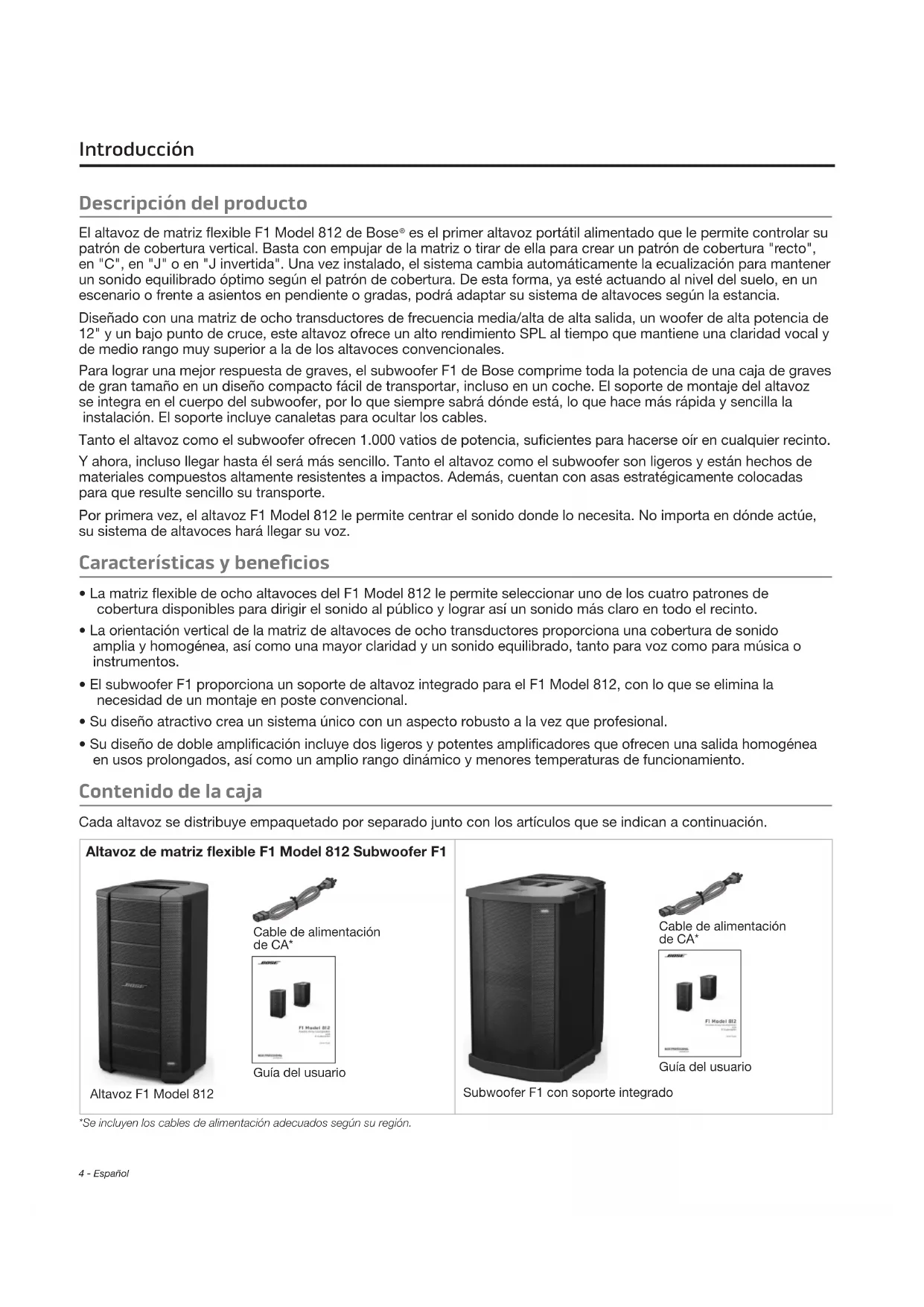 - Su diseño de doble amplificación incluye dos ligeros y potentes amplificadores que ofrecen una salida homogénea en usos prolongados, así como un amplio rango dinámico y menores temperaturas de funcionamiento. Contenido de la caja Cada altavoz se distribuye empaquetado por separado junto con los artículos que se indican a continuación. Altavoz de matriz flexible F1 Model 812 Subwoofer F1 Cable de alimentación de CA* Guía del usuario Altavoz F1 Model 812 Cable de alimentación de CA* Guía del usuario Subwoofer F1 con soporte integrado *Se incluyen los cables de alimentación adecuados según su región.Español - 5 Introducción Altavoz de matriz flexible F1 Model 812 Nota: El F1 Model 812 incluye inserciones roscadas M8 para utilizar soportes. PRECAUCIÓN: Sólo los instaladores profesionales con conocimiento de los accesorios adecuados y las técnicas de montaje seguro deberán intentar instalar cualquier altavoz en suspensión. SUPERIOR