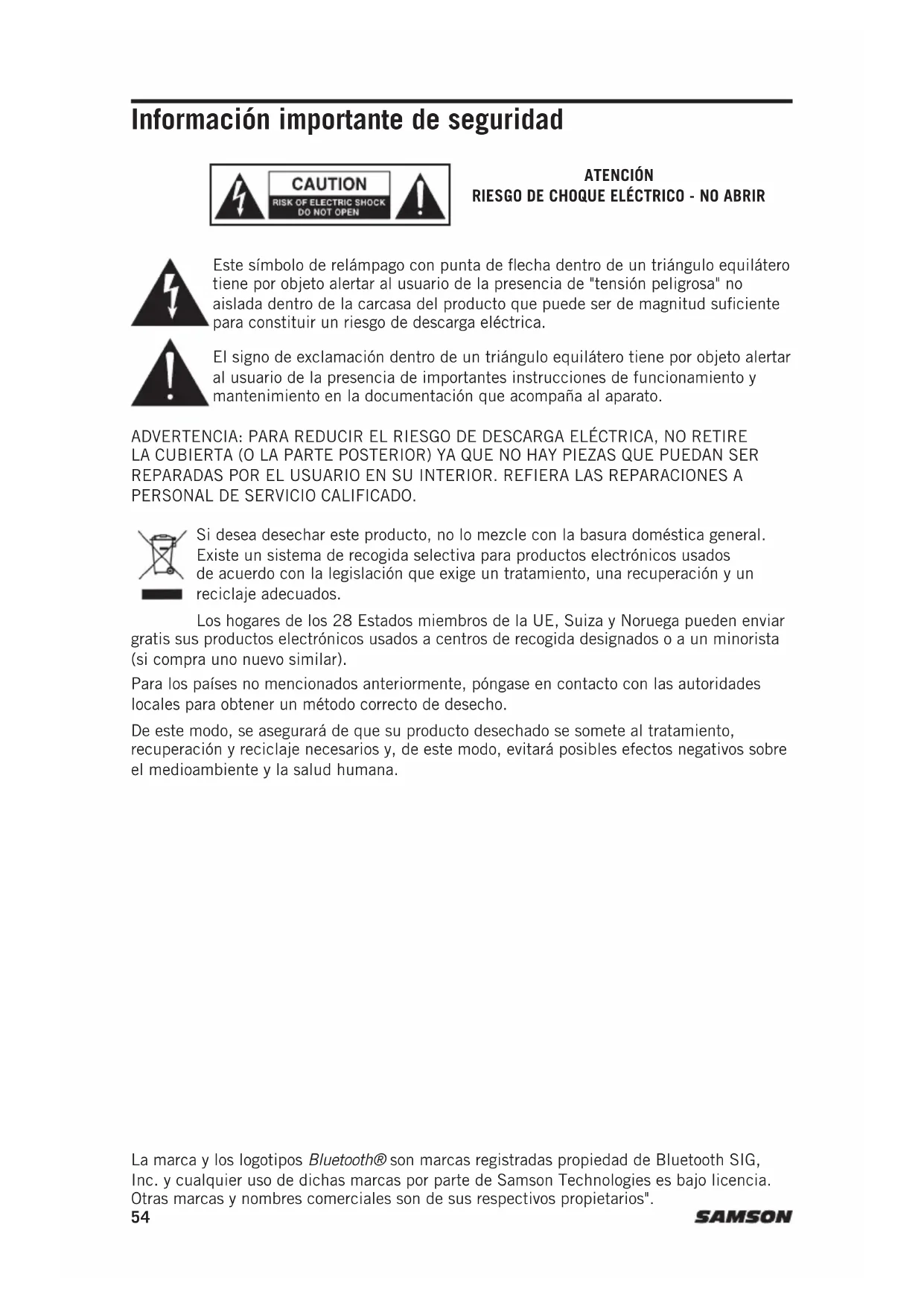 Introducción Gracias por comprar el sistema de sonido portátil XP312w alimentado por batería, con conectividad inalámbrica Bluetooth®. Ligero y compacto, el XP312w tiene una potencia de 300 vatios y pesa menos de 12,47 kg (38 libras), lo que lo convierte en un excelente complemento para cualquier aplicación de altavoces móviles. Batería interna recargable para hasta 12 horas de uso continuo El XP312w también puede ser alimentado por CA (con el cable de alimentación incluido). La manija telescópica de bloqueo y las ruedas integradas, hacen que el XP312w sea fácil de transportar a cualquier salida. El XP312w es una solución completa todo en uno que proporciona la flexibilidad de un mezclador de tres canales (con entradas para micrófono, instrumento y dispositivos de nivel de línea), una salida de línea para conectar varios altavoces y controles de tono de graves y agudos. Para un rendimiento totalmente independiente, el XP312w incluye un sistema inalámbrico de mano Samson Concert 88a y una ranura adicional para añadir un segundo sistema Concert 88a. También hay un conector USB para añadir un sistema inalámbrico Samson XPD Series. Ya sea que esté buscando un sistema de sonido para usar al aire libre, en el aula, para karaoke, para presentaciones o para interpretar música en vivo, el XP312w proporciona audio portátil de alta calidad en un pequeño paquete con alimentación propia. Le recomendamos que guarde los siguientes registros como referencia, así como una copia de su recibo de venta. Número de serie: ______________________________________________________ Fecha de compra: _____________________________________________________ Si tiene alguna pregunta o comentario sobre el sistema PA portátil XP312w o cualquier otro producto de Samson, no dude en ponerse en contacto con nosotros en support@samsontech. com. Con el cuidado y mantenimiento adecuados, su sistema PA portátil XP312w funcionará sin problemas durante muchos años. Si su sistema PA portátil XP312w alguna vez requiere servicio, debe obtener un número de autorización de devolución (RA, por su sigla inglesa) antes de enviar su unidad a Samson. Sin este número, la unidad no será aceptada. Por favor visite www.samsontech.com/ra para obtener un número de RA antes de enviar su unidad. Por favor, conserve los materiales de embalaje originales y, si es posible, devuelva la unidad en su caja original. Si su sistema PA portátil XP312w se compró fuera de los Estados Unidos, póngase en contacto con su distribuidor local. Características