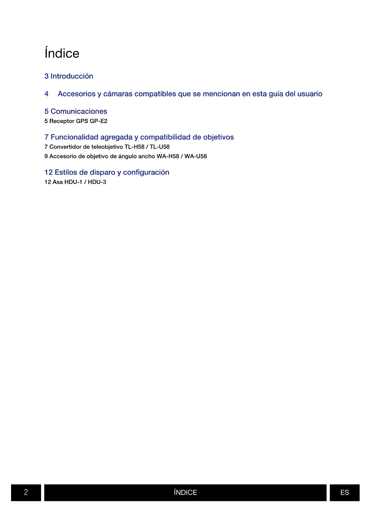 3 Introducción 4 Accesorios y cámaras compatibles que se mencionan en esta guía del usuario 5 Comunicaciones 5 Receptor GPS GP-E2 7 Funcionalidad agregada y compatibilidad de objetivos 7 Convertidor de teleobjetivo TL-H58 / TL-U58 9 Accesorio de objetivo de ángulo ancho WA-H58 / WA-U58 12 Estilos de disparo y configuración 12 Asa HDU-1 / HDU-3 ÍndiceINTRODUCCIÓN