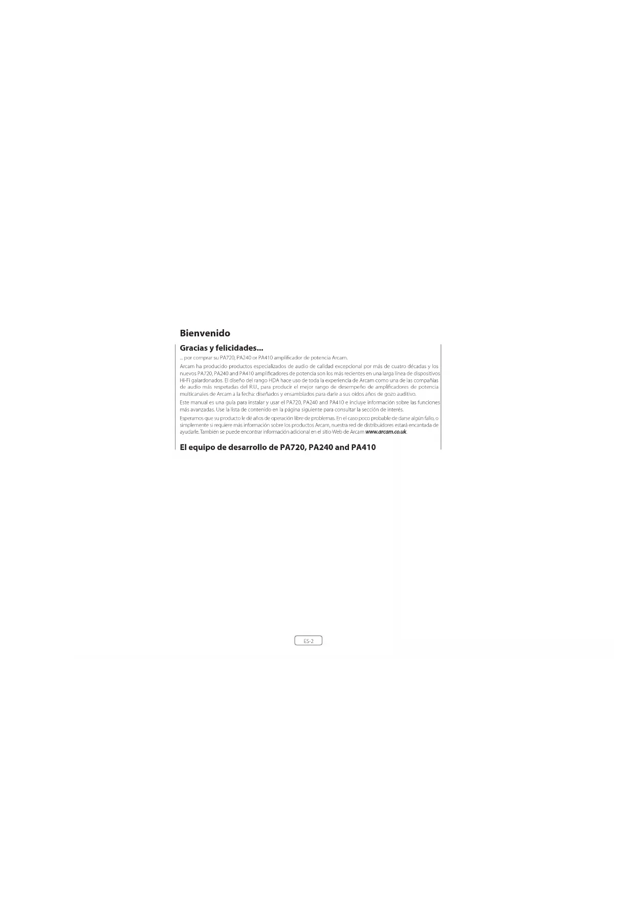 PA720 / PA240 / PA410ES-2 Bienvenido Gracias y felicidades... ... por comprar su PA720, PA240 or PA410 amplificador de potencia Arcam. Arcam ha producido productos especializados de audio de calidad excepcional por más de cuatro décadas y los nuevos PA720, PA240 and PA410 amplificadores de potencia son los más recientes en una larga línea de dispositivos Hi-Fi galardonados. El diseño del rango HDA hace uso de toda la experiencia de Arcam como una de las compañías de audio más respetadas del R.U., para producir el mejor rango de desempeño de amplificadores de potencia multicanales de Arcam a la fecha: diseñados y ensamblados para darle a sus oídos años de gozo auditivo. Este manual es una guía para instalar y usar el PA720, PA240 and PA410 e incluye información sobre las funciones más avanzadas. Use la lista de contenido en la página siguiente para consultar la sección de interés. Esperamos que su producto le dé años de operación libre de problemas. En el caso poco probable de darse algún fallo, o simplemente si requiere más información sobre los productos Arcam, nuestra red de distribuidores estará encantada de ayudarle. También se puede encontrar información adicional en el sitio Web de Arcam www.arcam.co.uk. El equipo de desarrollo de PA720, PA240 and PA410ES-3
