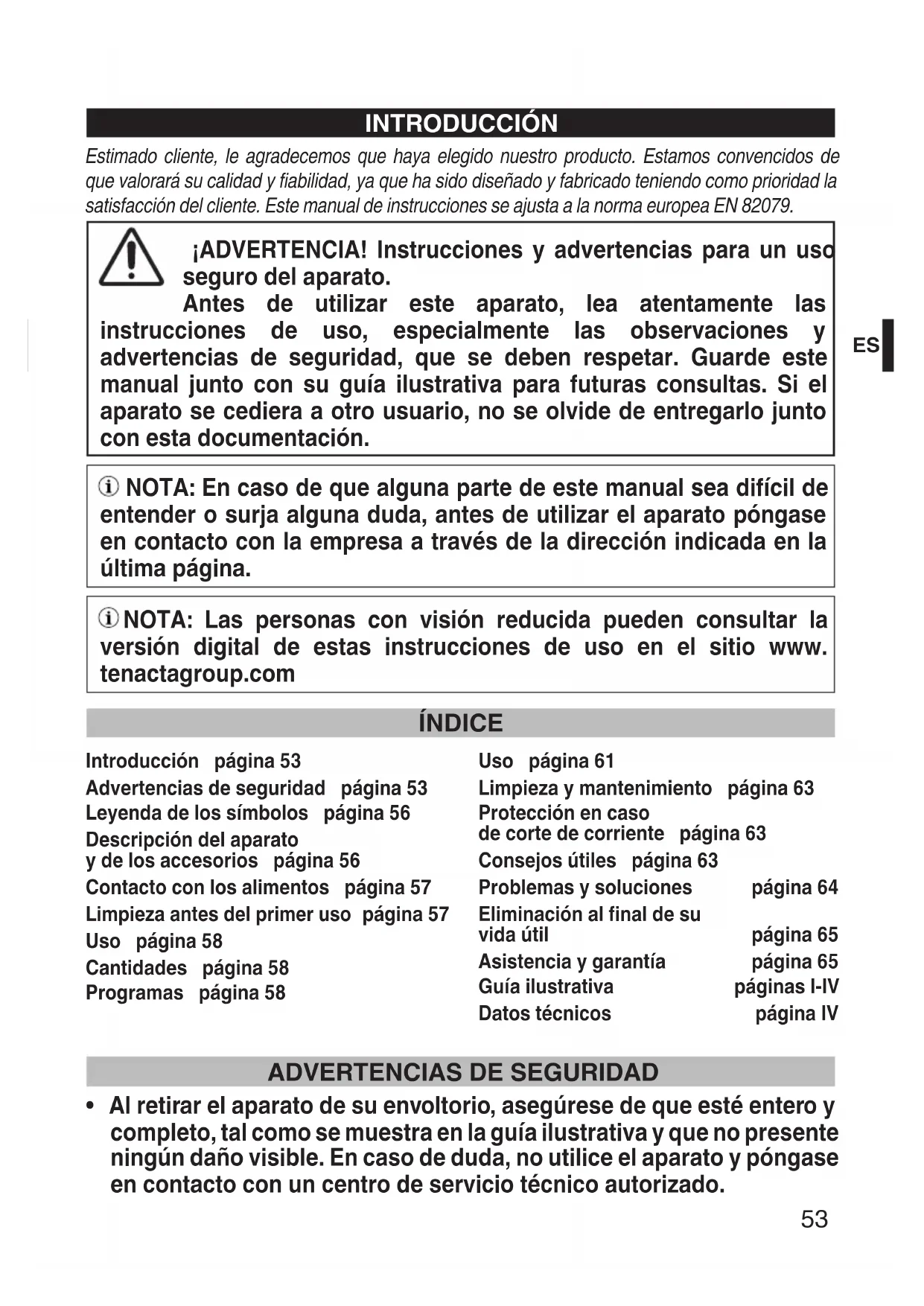 INTRODUCCIÓN Estimado cliente, le agradecemos que haya elegido nuestro producto. Estamos convencidos de que valorará su calidad y fiabilidad, ya que ha sido diseñado y fabricado teniendo como prioridad la satisfacción del cliente. Este manual de instrucciones se ajusta a la norma europea EN 82079. ¡ADVERTENCIA! Instrucciones y advertencias para un uso seguro del aparato. Antes de utilizar este aparato, lea atentamente las instrucciones de uso, especialmente las observaciones y advertencias de seguridad, que se deben respetar. Guarde este manual junto con su guía ilustrativa para futuras consultas. Si el aparato se cediera a otro usuario, no se olvide de entregarlo junto con esta documentación. NOTA: En caso de que alguna parte de este manual sea difícil de entender o surja alguna duda, antes de utilizar el aparato póngase en contacto con la empresa a través de la dirección indicada en la última página. NOTA: Las personas con visión reducida pueden consultar la versión digital de estas instrucciones de uso en el sitio www. tenactagroup.com ÍNDICE Introducción página 53 Advertencias de seguridad página 53 Leyenda de los símbolos página 56 Descripción del aparato y de los accesorios página 56 Contacto con los alimentos página 57 Limpieza antes del primer uso página 57 Uso página 58 Cantidades página 58 Programas página 58 Uso página 61 Limpieza y mantenimiento página 63 Protección en caso de corte de corriente página 63 Consejos útiles página 63 Problemas y soluciones página 64 Eliminación al final de su vida útil página 65 Asistencia y garantía página 65 Guía ilustrativa páginas I-IV Datos técnicos página IV