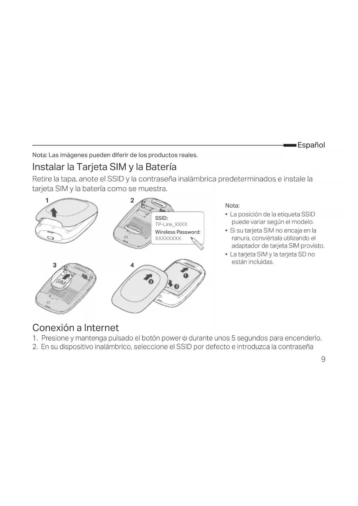 Nota:• La posición de la etiqueta SSID puede variar según el modelo.• Si su tarjeta SIM no encaja en la ranura, conviértala utilizando el adaptador de tarjeta SIM provisto.• La tarjeta SIM y la tarjeta SD no están incluidas.