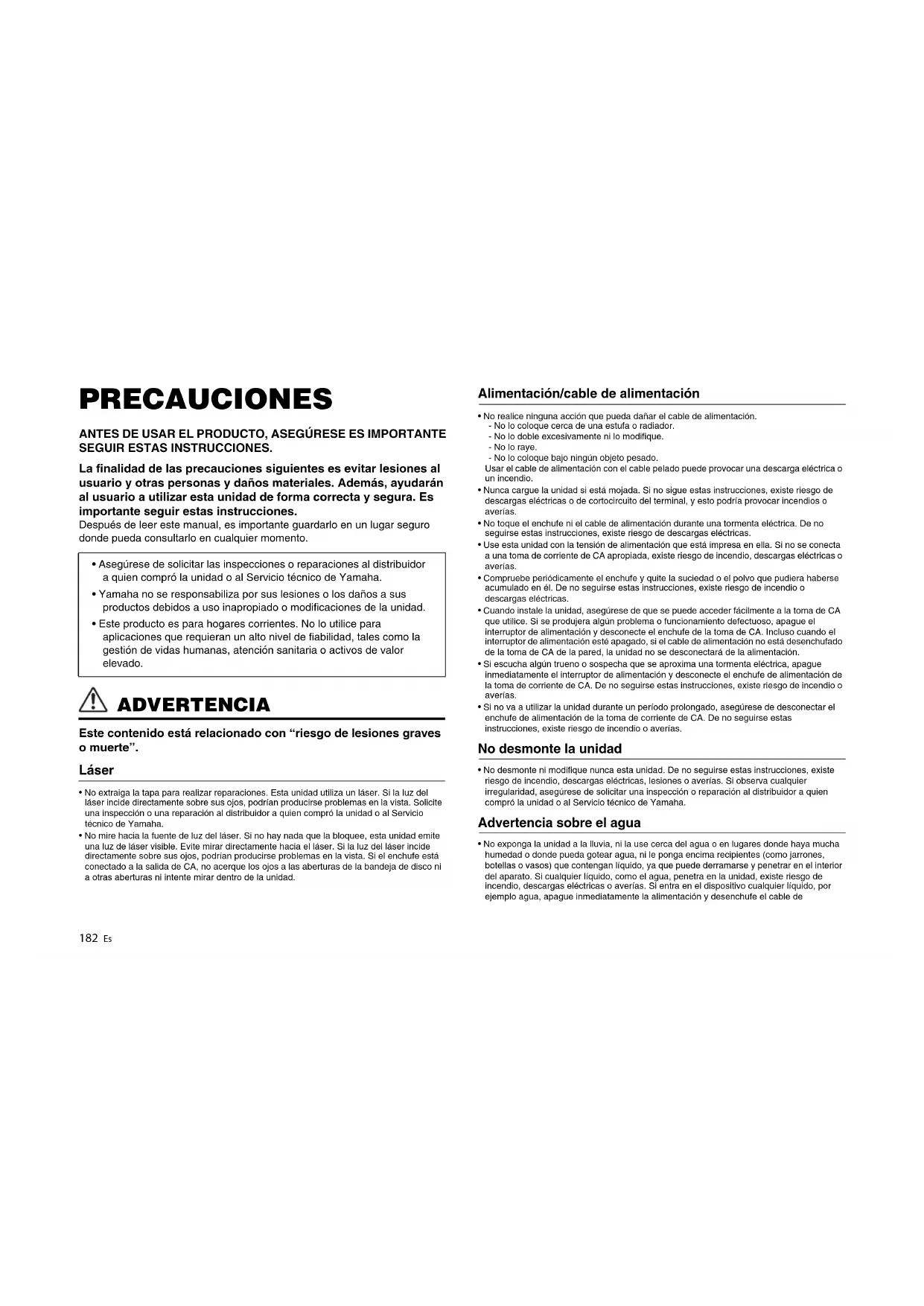 - Especificaciones 82 Es PRECAUCIONES ANTES DE USAR EL PRODUCTO, ASEGÚRESE ES IMPORTANTE SEGUIR ESTAS INSTRUCCIONES. La finalidad de las precauciones siguientes es evitar lesiones al usuario y otras personas y daños materiales. Además, ayudarán al usuario a utilizar esta unidad de forma correcta y segura. Es importante seguir estas instrucciones. Después de leer este manual, es importante guardarlo en un lugar seguro donde pueda consultarlo en cualquier momento. ADVERTENCIA Este contenido está relacionado con “riesgo de lesiones graves o muerte”. Láser p. 2161
