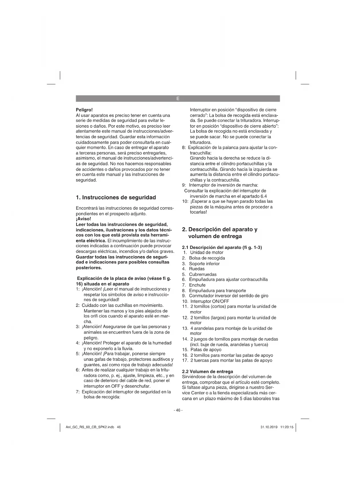 Sirviéndose de la descripción del volumen de entrega, comprobar que el artículo esté completo. Si faltase alguna pieza, dirigirse a nuestro Ser- vice Center o a la tienda especializada más cer- cana en un plazo máximo de 5 días laborales tras Anl_GC_RS_60_CB_SPK2.indb 46Anl_GC_RS_60_CB_SPK2.indb 46 31.10.2019 11:20:1531.10.2019 11:20:15E
