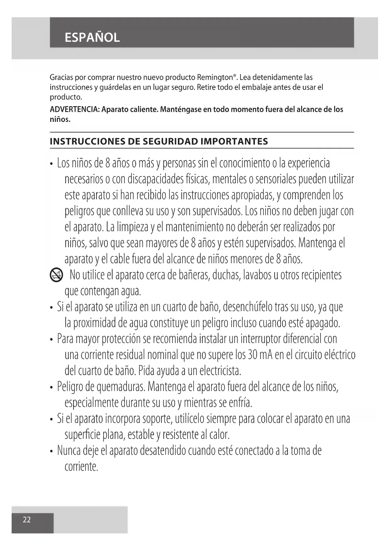 AE22 Gracias por comprar nuestro nuevo producto Remington®. Lea detenidamente las instrucciones y guárdelas en un lugar seguro. Retire todo el embalaje antes de usar el producto. ADVERTENCIA: Aparato caliente. Manténgase en todo momento fuera del alcance de los niños.