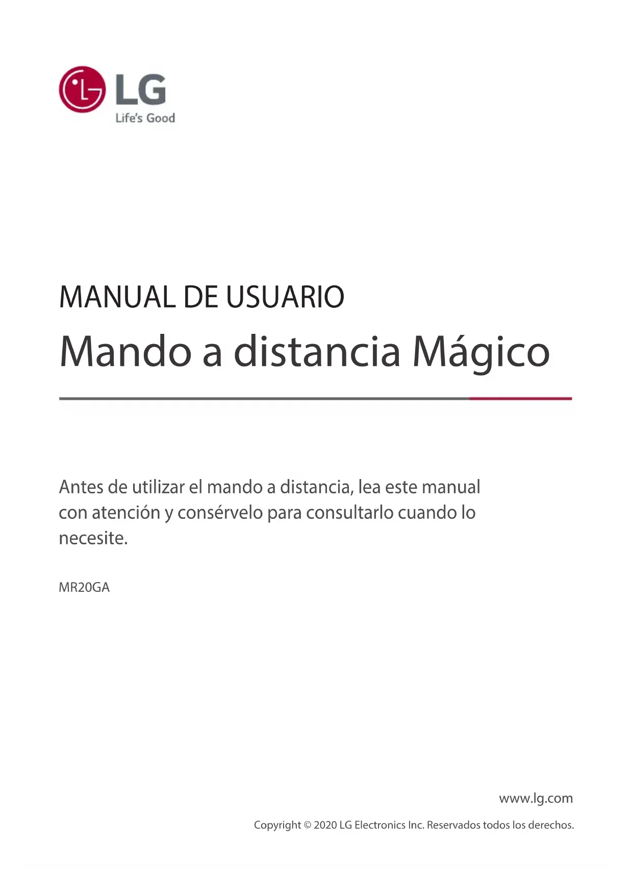 Descarga las instrucciones para tu Remoto en formato PDF gratis! Encuentra tus instrucciones MR20GA - LG y toma tu dispositivo electrónico nuevamente en la mano. En esta página están publicados todos los documentos necesarios para el uso de su dispositivo. MR20GA de la marca LG.