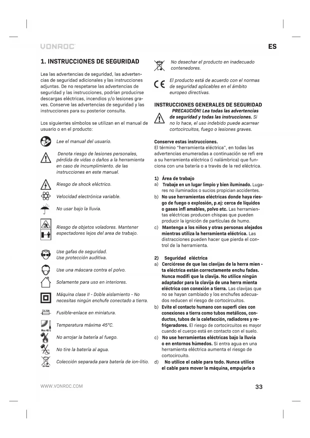No abra la batería. Existe peligro de cortocircuito. b) Proteja la batería del calor, p. ej., de la luz solar intensa continua, los incendios, el agua y la humedad. Peligro de explosión. c) En caso de daño y uso incorrecto de la batería, esta puede emitir vapores. Ventile el área y consulte un médico si se siente mal. Los vapo- res pueden irritar el sistema respiratorio. d) Utilice la batería solo junto con su producto Vonroc. Esta medida protege la batería de sobrecargas peligrosas. e) La batería se puede dañar con objetos puntia- gudos como clavos o destornilladores o si se somete a alguna fuerza exterior. Puede produ- cirse un cortocircuito interno que dé lugar a que la batería se incendie, emita humo, explote o se sobrecaliente.
