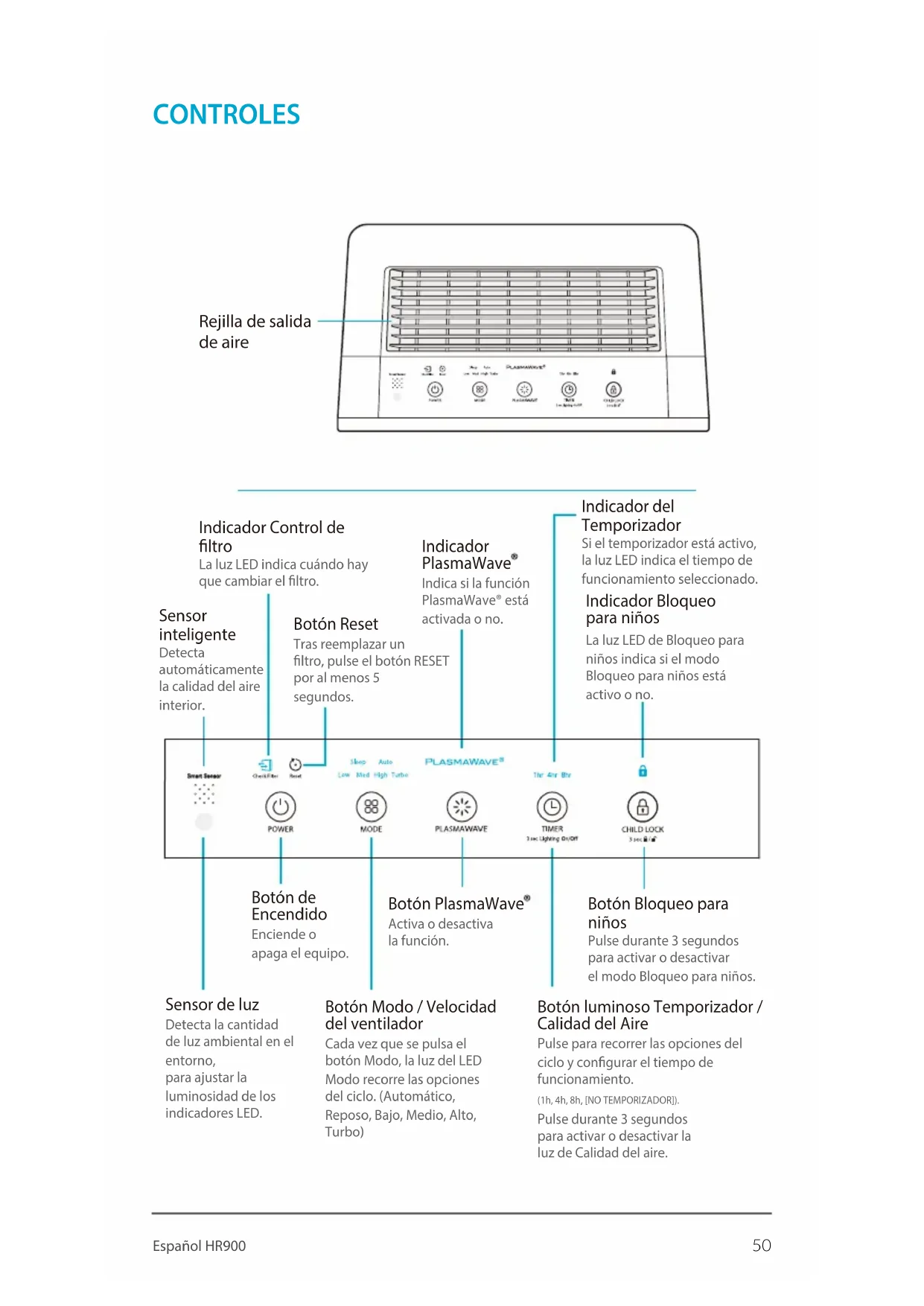 HR900 Contenido de la caja50 Español HR900 CONTROLES Rejilla de salida de aire Sensor de luz Detecta la cantidad de luz ambiental en el entorno, para ajustar la luminosidad de los indicadores LED. Botón Modo / Velocidad del ventilador Cada vez que se pulsa el botón Modo, la luz del LED Modo recorre las opciones del ciclo. (Automático, Reposo, Bajo, Medio, Alto, Turbo) Botón Bloqueo para niños Pulse durante 3 segundos para activar o desactivar el modo Bloqueo para niños. Indicador del Temporizador Si el temporizador está activo, la luz LED indica el tiempo de funcionamiento seleccionado. Botón luminoso Temporizador / Calidad del Aire Pulse para recorrer las opciones del ciclo y congurar el tiempo defuncionamiento.(1h, 4h, 8h, [NO TEMPORIZADOR]).Pulse durante 3 segundospara activar o desactivar laluz de Calidad del aire. Sensor inteligente Detecta automáticamente la calidad del aire interior. Botón Reset Tras reemplazar un ltro, pulse el botón RESET por al menos 5 segundos. Botón de Encendido Enciende o apaga el equipo. Indicador Bloqueo para niños La luz LED de Bloqueo para niños indica si el modo Bloqueo para niños está activo o no. Indicador Control de ltro La luz LED indica cuándo hay que cambiar el ltro. Indicador PlasmaWave Indica si la función PlasmaWave® está activada o no. Botón PlasmaWave Activa o desactiva la función.51 Español HR900
