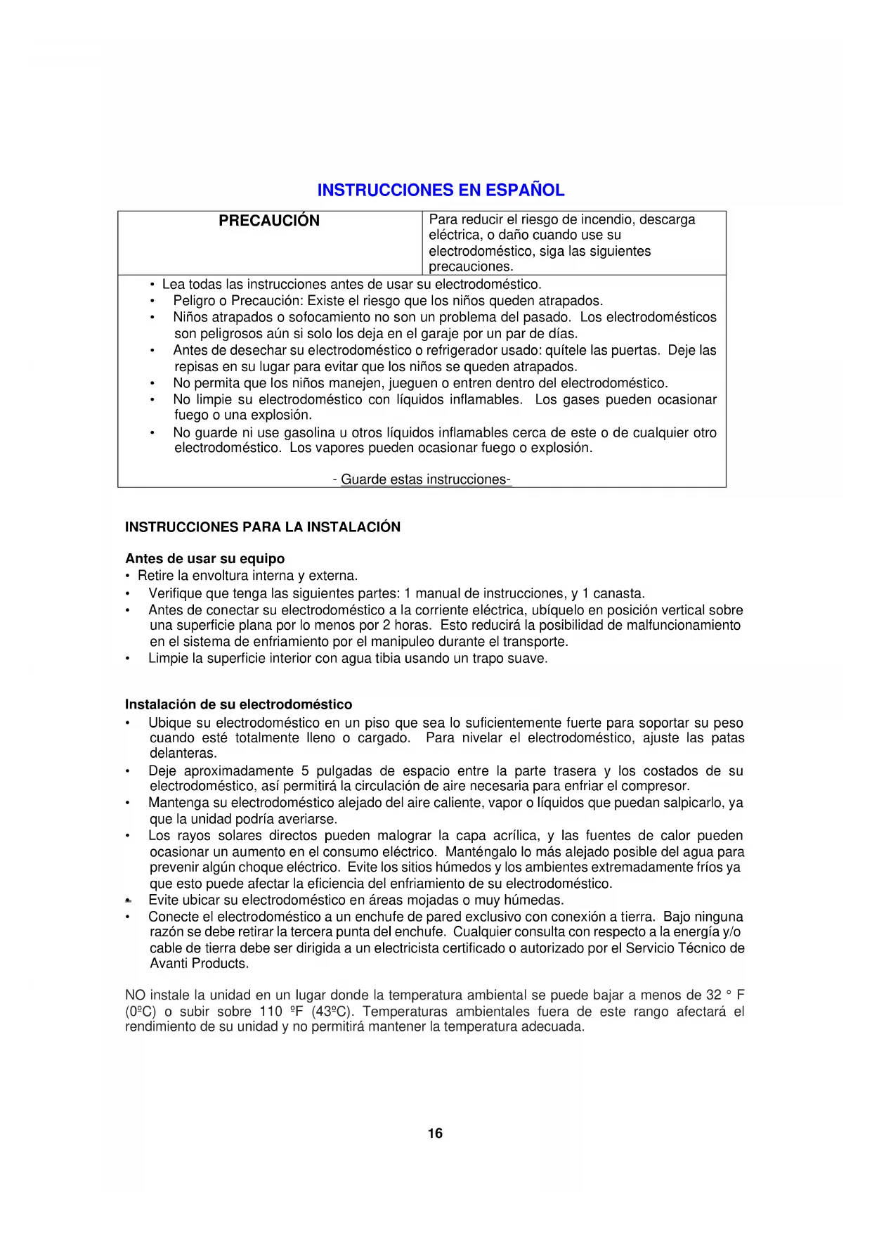 - Conecte el electrodoméstico a un enchufe de pared exclusivo con conexión a tierra. Bajo ninguna razón se debe retirar la tercera punta del enchufe. Cualquier consulta con respecto a la energía y/o cable de tierra debe ser dirigida a un electricista certificado o autorizado por el Servicio Técnico de Avanti Products. NO instale la unidad en un lugar donde la temperatura ambiental se puede bajar a menos de 32 ° F (0ºC) o subir sobre 110 ºF (43ºC). Temperaturas ambientales fuera de este rango afectará el rendimiento de su unidad y no permitirá mantener la temperatura adecuada.