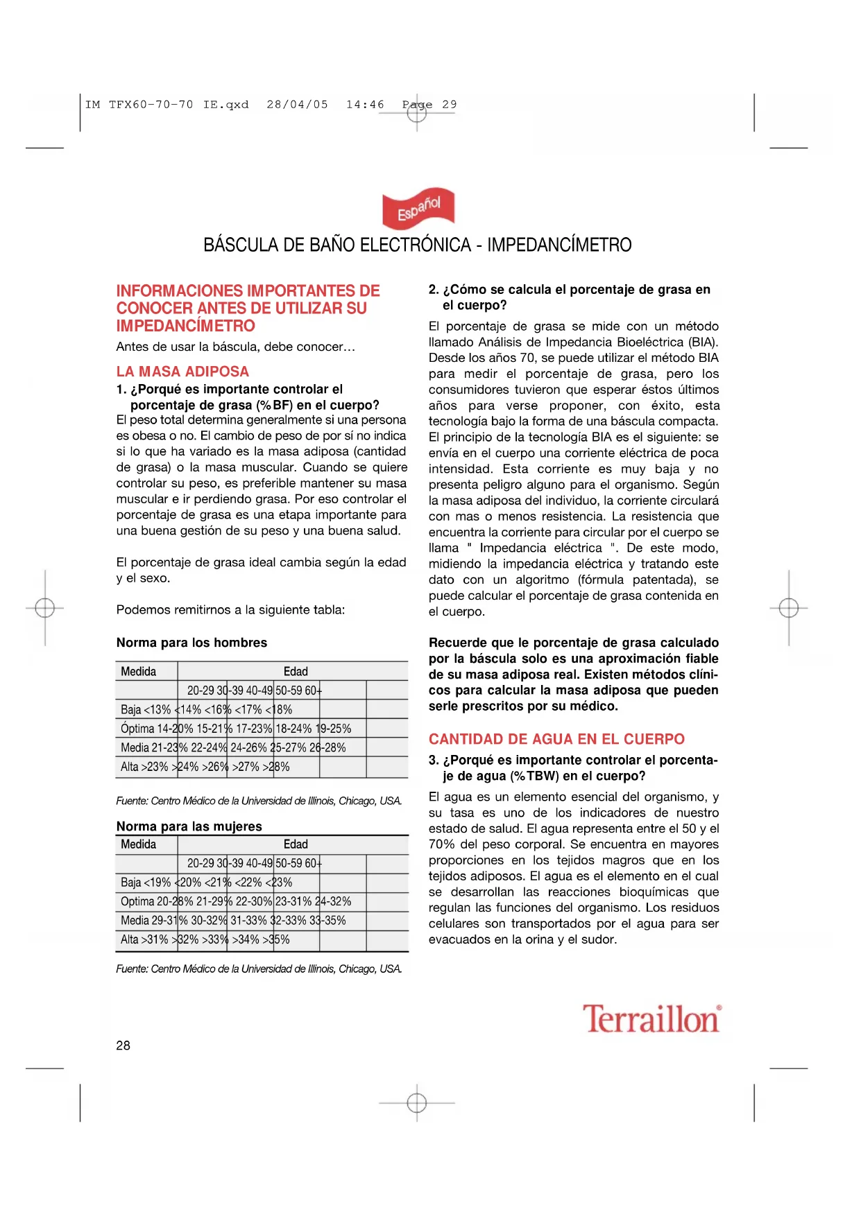 je de agua (%TBW) en el cuerpo? El agua es un elemento esencial del organismo, y su tasa es uno de los indicadores de nuestro estado de salud. El agua representa entre el 50 y el 70% del peso corporal. Se encuentra en mayores proporciones en los tejidos magros que en los tejidos adiposos. El agua es el elemento en el cual se desarrollan las reacciones bioquímicas que regulan las funciones del organismo. Los residuos celulares son transportados por el agua para ser evacuados en la orina y el sudor. BÁSCULA DE BAÑO ELECTRÓNICA - IMPEDANCÍMETRO Medida Edad 20-29 30-39 40-49 50-59 60+ Baja <13% <14% <16% <17% <18% Óptima 14-20% 15-21% 17-23% 18-24% 19-25% Media 21-23% 22-24% 24-26% 25-27% 26-28% Alta >23% >24% >26% >27% >28% Medida Edad 20-29 30-39 40-49 50-59 60+ Baja <19% <20% <21% <22% <23% Optima 20-28% 21-29% 22-30% 23-31% 24-32% Media 29-31% 30-32% 31-33% 32-33% 33-35% Alta >31% >32% >33% >34% >35% IM TFX60-70-70 IE.qxd 28/04/05 14:46 Page 2929 El agua da forma a las células, ayuda a mantener la temperatura del cuerpo, proporciona la humedad necesaria para la piel y las mucosas, protege los órganos vitales, lubrifica las articulaciones y es un componente de numerosos fluidos corporales. La tasa de agua varía según el nivel de hidratación del organismo y su estado de salud. Medir el por- centaje de agua puede ser un instrumento útil para mantener un buen estado de salud. Al igual que la evaluación de la tasa de grasa, la función %TBW de la báscula se calcula por el método de BIA. La evaluación del porcentaje de agua puede variar según el nivel de hidratación, es decir según la cantidad de agua que ha bebido o perdido en sudor justo antes de la medida. Para mayor precisión, evite las fluctuaciones importantes de su nivel de hidratación justo antes de la medida. La evaluación del porcentaje de agua dada por la báscula también perderá en precisión en el caso de las personas con enfermedades que generan retención de agua en el cuerpo. El porcentaje ideal de agua de un individuo varia según la edad y el sexo. Podemos remitirnos al gráfico y la tabla siguientes: Variación del Porcentaje de Agua en el cuerpo según la Edad y el Sexo: Fuente: Centro Médico de la Universidad de Illinois, Chicago, USA. Recuerde que le porcentaje de agua calculado por la báscula solo es una aproximación fiable de su porcentaje de agua real. Existen métodos clínicos para calcular el porcentaje de agua en el cuerpo que pueden serle prescritos por su médico.