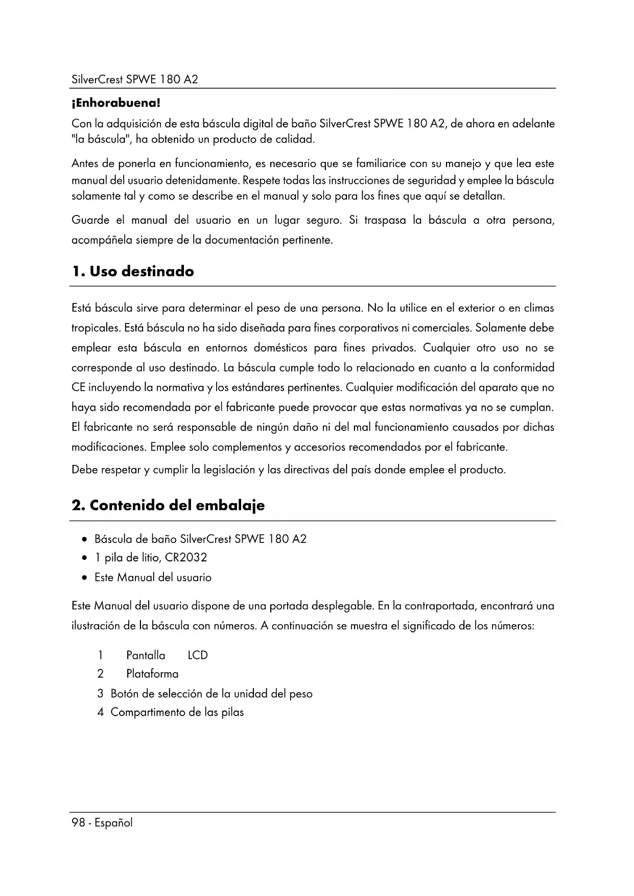 - Este Manual del usuario Este Manual del usuario dispone de una portada desplegable. En la contraportada, encontrará una ilustración de la báscula con números. A continuación se muestra el significado de los números: 1 Pantalla LCD 2 Plataforma 3 Botón de selección de la unidad del peso 4 Compartimento de las pilasSilverCrest SPWE 180 A2 Español - 99
