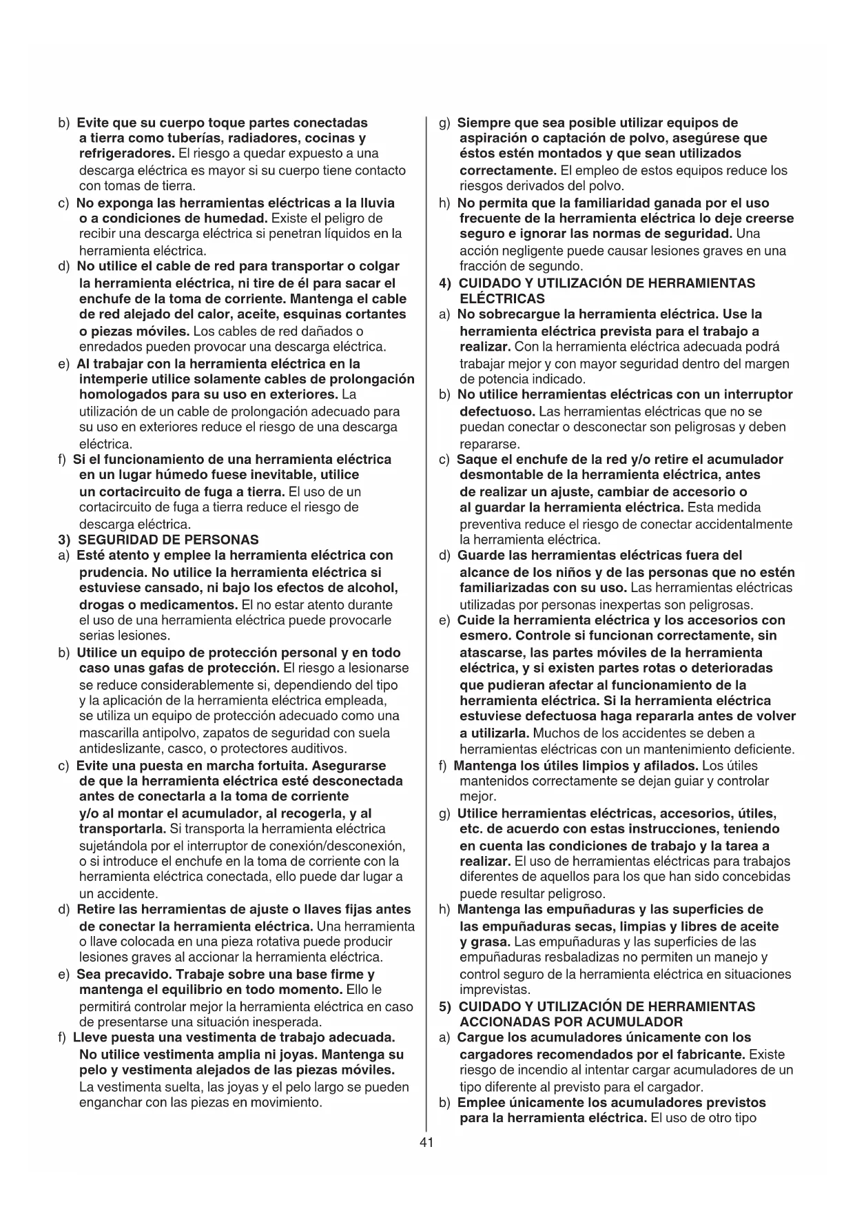 ELÉCTRICAS a) No sobrecargue la herramienta eléctrica. Use la herramienta eléctrica prevista para el trabajo a realizar. Con la herramienta eléctrica adecuada podrá trabajar mejor y con mayor seguridad dentro del margen de potencia indicado. b) No utilice herramientas eléctricas con un interruptor defectuoso. Las herramientas eléctricas que no se puedan conectar o desconectar son peligrosas y deben repararse. c) Saque el enchufe de la red y/o retire el acumulador desmontable de la herramienta eléctrica, antes de realizar un ajuste, cambiar de accesorio o al guardar la herramienta eléctrica. Esta medida preventiva reduce el riesgo de conectar accidentalmente la herramienta eléctrica. d) Guarde las herramientas eléctricas fuera del alcance de los niños y de las personas que no estén familiarizadas con su uso. Las herramientas eléctricas utilizadas por personas inexpertas son peligrosas. e) Cuide la herramienta eléctrica y los accesorios con esmero. Controle si funcionan correctamente, sin atascarse, las partes móviles de la herramienta eléctrica, y si existen partes rotas o deterioradas que pudieran afectar al funcionamiento de la herramienta eléctrica. Si la herramienta eléctrica estuviese defectuosa haga repararla antes de volver a utilizarla. Muchos de los accidentes se deben a herramientas eléctricas con un mantenimiento deciente. f) Mantenga los útiles limpios y alados. Los útiles mantenidos correctamente se dejan guiar y controlar mejor. g) Utilice herramientas eléctricas, accesorios, útiles, etc. de acuerdo con estas instrucciones, teniendo en cuenta las condiciones de trabajo y la tarea a realizar. El uso de herramientas eléctricas para trabajos diferentes de aquellos para los que han sido concebidas puede resultar peligroso. h) Mantenga las empuñaduras y las supercies de las empuñaduras secas, limpias y libres de aceite y grasa. Las empuñaduras y las supercies de las empuñaduras resbaladizas no permiten un manejo y control seguro de la herramienta eléctrica en situaciones imprevistas.