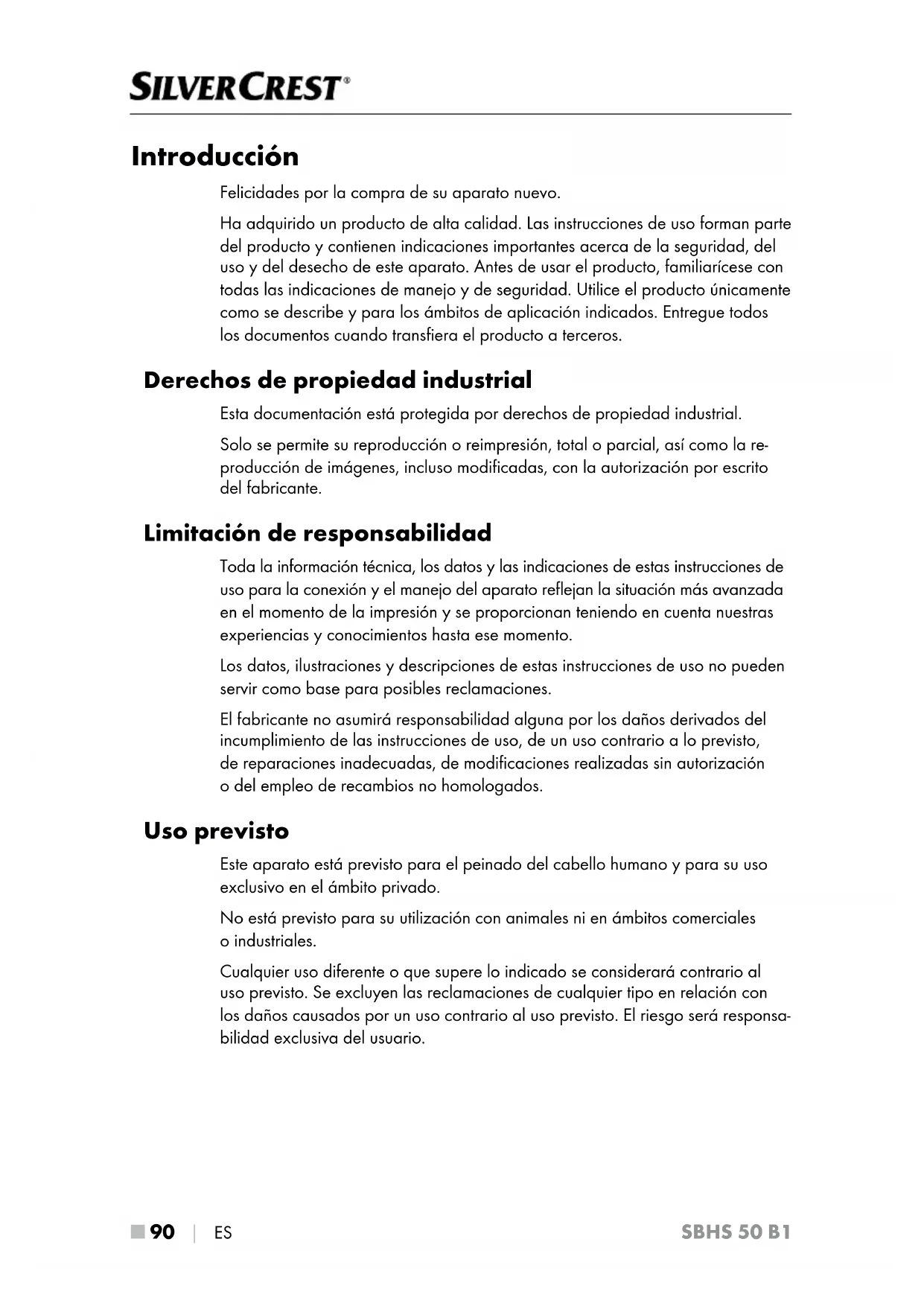- Importador ■ 90 │ ES SBHS 50 B1 Introducción Felicidades por la compra de su aparato nuevo. Ha adquirido un producto de alta calidad. Las instrucciones de uso forman parte del producto y contienen indicaciones importantes acerca de la seguridad, del uso y del desecho de este aparato. Antes de usar el producto, familiarícese con todas las indicaciones de manejo y de seguridad. Utilice el producto únicamente como se describe y para los ámbitos de aplicación indicados. Entregue todos los documentos cuando transfiera el producto a terceros. Derechos de propiedad industrial Esta documentación está protegida por derechos de propiedad industrial. Solo se permite su reproducción o reimpresión, total o parcial, así como la re- producción de imágenes, incluso modificadas, con la autorización por escrito del fabricante. Limitación de responsabilidad Toda la información técnica, los datos y las indicaciones de estas instrucciones de uso para la conexión y el manejo del aparato reflejan la situación más avanzada en el momento de la impresión y se proporcionan teniendo en cuenta nuestras experiencias y conocimientos hasta ese momento. Los datos, ilustraciones y descripciones de estas instrucciones de uso no pueden servir como base para posibles reclamaciones. El fabricante no asumirá responsabilidad alguna por los daños derivados del incumplimiento de las instrucciones de uso, de un uso contrario a lo previsto, de reparaciones inadecuadas, de modificaciones realizadas sin autorización o del empleo de recambios no homologados. Uso previsto Este aparato está previsto para el peinado del cabello humano y para su uso exclusivo en el ámbito privado. No está previsto para su utilización con animales ni en ámbitos comerciales o industriales. Cualquier uso diferente o que supere lo indicado se considerará contrario al uso previsto. Se excluyen las reclamaciones de cualquier tipo en relación con los daños causados por un uso contrario al uso previsto. El riesgo será responsa- bilidad exclusiva del usuario.ES │ 91 ■ SBHS 50 B1 Volumen de suministro El aparato se suministra de serie con los siguientes componentes: ▯ Cepillo modelador ▯ Estuche ▯ Instrucciones de uso INDICACIÓN ► Compruebe la integridad del suministro y si hay daños visibles. ► Si el suministro está incompleto o se observan daños debido a un embalaje deficiente o al transporte, póngase en contacto con la línea directa de asistencia (consulte el capítulo Asistencia técnica). Descripción del aparato 1 Punta de agarre 2 Moldeador de pelo (con púas térmicas) 3 Botón de desenrollado 4 LED para pelo grueso (nivel 2) 5 LED para pelo fino (nivel 1) 6 Interruptor del nivel de calor 7 Ojal para colgar 8 Estuche Características técnicas Tensión de red 220 – 240V ∼ (corriente alterna), 50/60 Hz Consumo de potencia 50W Nivel de temperatura1 Aprox. 150°C (+/- 10°C) Nivel de temperatura2 Aprox. 180°C (+/- 10°C) Clase de protección II / (aislamiento doble)■ 92 │ ES SBHS 50 B1 Indicaciones de seguridad p. 100