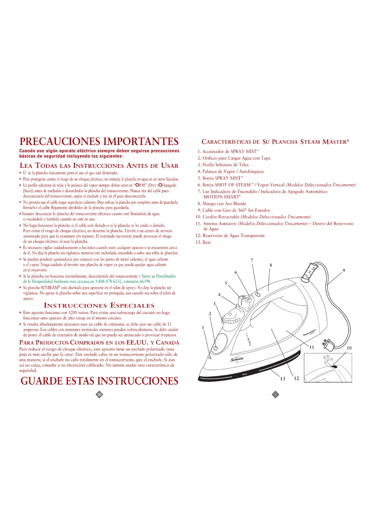 Si la plancha no funciona normalmente, desconectela del tomacorriente y llama su Distribuidor de la Hospitalidad Sunbeam mas cercana en 1-888-878-6232, extension 66598.
