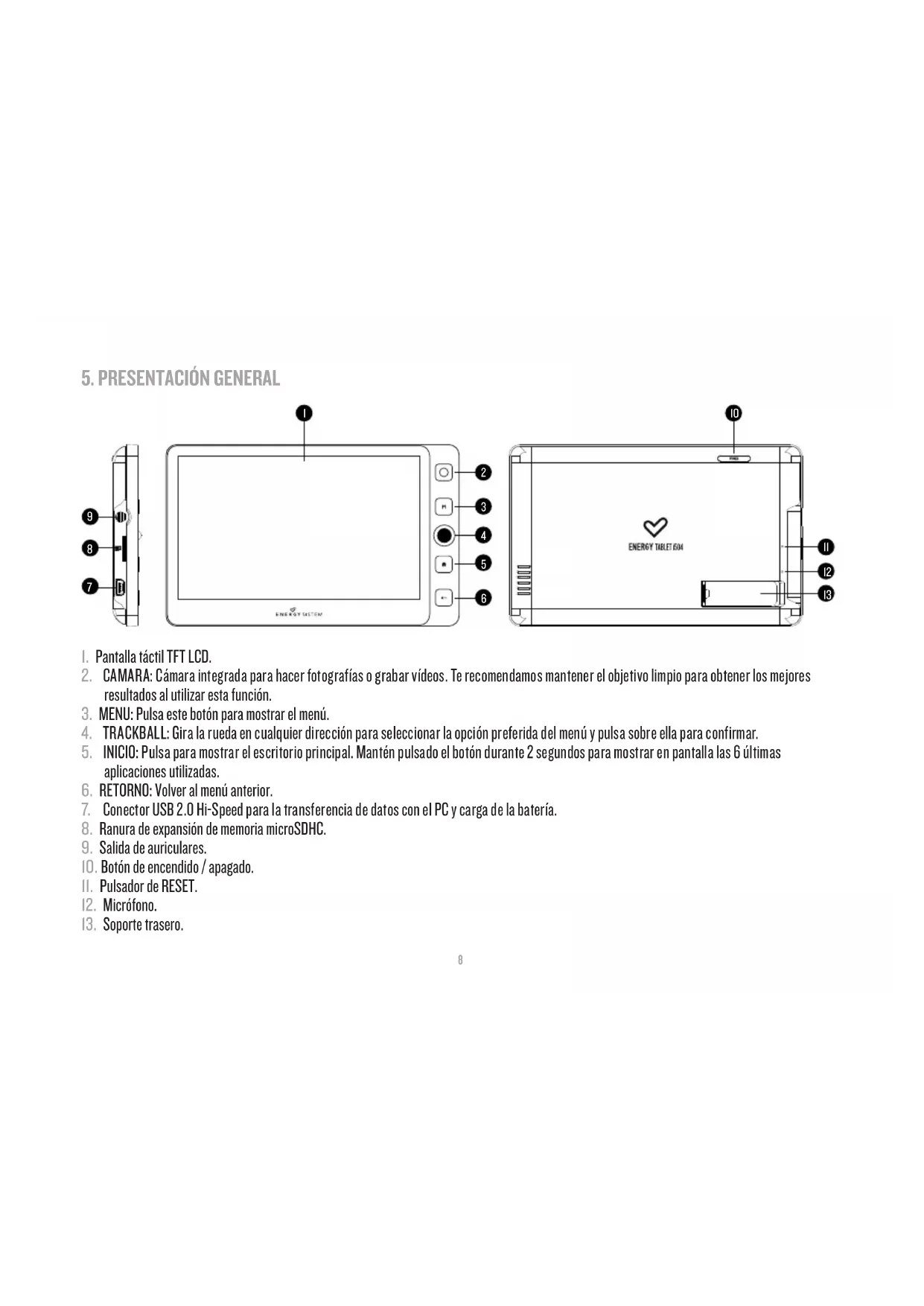 , con el que podrás acceder a Internet en cualquier momento y lugar, consultar tu correo electrónico, hacer fotografías, grabar vídeos o reproducir todo tipo de contenido multimedia (vídeos en alta definición (HD), música, fotografías, eBooks, etc.). Además, hay disponibles miles de aplicaciones y juegos para que puedas sacarle el máximo provecho al dispositivo. El sistema dispone de una pantalla táctil panorámica de 5’’ y 800x480 pixeles, cámara para hacer fotografías y grabar video, TrackBall, sensor de rotación de pantalla, altavoz y lector de tarjetas microSDHC. También puedes conectar dispositivos USB a tu Energy™ Tablet, como discos duros, pendrives, un teclado o ratón. Te aconsejamos que leas el presente manual de usuario para disfrutar del producto de una manera segura y con las mejores prestaciones.