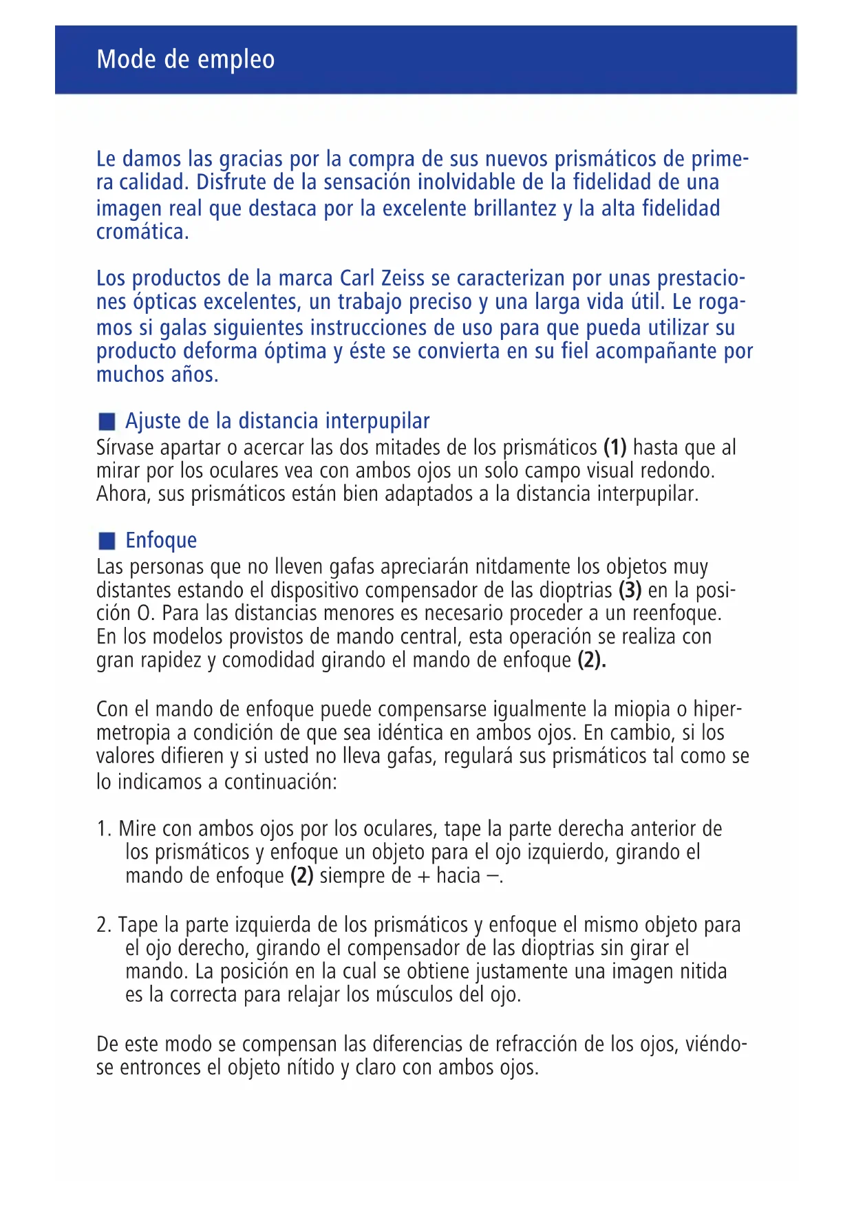 el ojo derecho, girando el compensador de las dioptrias sin girar el mando. La posición en la cual se obtiene justamente una imagen nitida es la correcta para relajar los músculos del ojo. De este modo se compensan las diferencias de refracción de los ojos, viéndo- se entronces el objeto nítido y claro con ambos ojos. 02_20x60S_innen_pant.qxd 10.03.2009 9:07 Uhr Seite 12901190 Zeiss 02_GBH 20x60 S_Innen / S. 13 / Pantone Reflex Blue / Schwarz 20 x 60 S En los prismáticos 20x60 S no hace falta compensar la ametropia si Vd. Ileva las gafas puestas, ya que éstas corrigen tanto las diferencias de refracción y los defectos astigmáticos de ambos ojos. EI enfoque de los prismáticos para las diferentes distancias de observación se realiza con el mando de enfoque. Las personas con gafas rebatirán las anteojeras del ocular sobre la montura del ocular como muestra B. Las personas sin gafas utilizan los prismáticos con las anteojeras subidas, come en A. Esta adaptación no necesita más que dos manipulaciones. Observación correcta y uso de la estabilización AI apretar el pulsador (4), el sistema óptico de sus prismáticos 20x60 S queda estabilizado y la imagen casi no se moverá. Al observar par largo tiem- po desde el mismo lugar, es muy útil servirse de un tripode de fotografia. Apriete las anteojeras firmemente a las cejas o en caso de utilizar gafas, con- tra la parte de las mismas prevista para mirar lejos y enfoque con el mando central el objeto observado. Cuidado y mantenimiento Sus prismáticos Carl Zeiss no requieren ningún cuidado especial. Las partí- culas de suciedad gruesas (p.ej. arena) en las lentes no se frotarán, sino se soplarán con una perilla o se eliminarán con un pincel. Tras cierto tiempo, las huellas digitales podrán atacar las superficies de las lentes. Contra el ataque de la óptica por hongos, que podría darse especialmente en las regiones trópicas, sirve guardar el visor en un lugar seco, ventilando siem- pre bien las superficies externas de las lentes. Nota especial: De ser posible, le rogamos transportar sus prismáticos 20x60 S únicamente en el correspondiente maletín, o en el bolso suministrable como accesorio, ya que son una protección perfecta. Sobre todo habrá que cuidar que, duran- te el transporte, los objetos que se encuentren encima de los prismáticos no activen involuntariamente el pulsador de estabilización. Rogamos conservar el embalaje original; recomendamos utilizarlo al trans- portar los primáticos por distancias más largas. 02_20x60S_innen_pant.qxd 10.03.2009 9:07 Uhr Seite 13901190 Zeiss 02_GBH 20x60 S_Innen / S. 14 / Pantone Reflex Blue / Schwarz Mode de empleo Cuidado ● Los giros rápidos del instrumento en torno al eje óptico pueden estor- bar ligeramente la función de los prismáticos 20x60 S. Las vibraciones fuertes y los movimientos bruscos se evitarán sobre todo al estar acti- vado el pulsador de estabilización (4), ya que de otra manera podrá resultar daños este sistema, no cubierto por la garantia. ● No mire bajo ningún concepto con los prismáticos hacia el solo fuentes de radiación láser – sus ojos prodrán quedar seriamente daños. 20x60 S Aumento 20x Diámetro del objetivo (mm) 60 Campo visual a 1000m (m) Ww 52 Diámetro de la pupila de salida (mm) 3 Distancia de enfoque mínima (m) 14 Margen de compensación de las dioptrías ≥ +/– 7 dpt Distancia interpupilar ajuste de/a (mm) 57 – 73 Altura con anteojeras replegadas (mm) 265 Anchura (mm) 161 Peso (g) 1.660 A prueba de salpicaduras ● Nos reservamos el derecho a modificaciones técnicas y a cambios de los componentes que constituyen el suministro. Datos técnicos 02_20x60S_innen_pant.qxd 10.03.2009 9:07 Uhr Seite 14Grattis till din nya, förstklassiga kikare! Upplev en naturtrogen bildåtergivning som utmärker sig genom knivskarp briljans och högsta färgåtergivning. Produkterna från märket Carl Zeiss präglas av extremt goda optiskapre- standa, en exakt bearbetning och lång livslängd. Beakta följandebruk- sanvisning för att få största möjliga nytta av Din produkt under många år framöver. Inställning av pupillavstandet De bägge okularmuffarna (1) svängs isär eller dras ihop tills man endast ser en cirkelrund bild med bägge ögonen. Därmed är kikaren inställd för just Ert pupillavstånd. Inställning av bildskärpa En person med normalsyn ser skarpt då dioptriinställningen (3) står på „0“. Vid kortare avstånd måste korrigering av inställningen göras. Detta sker snabbt och bekvämt genom att vrida på den räfflade centruminställningen (2). Även vid samma synfel på bägge ögonen görs inställningen direkt med den räfflade centrumskruven. Om ögonen har olika synskärpa och Ni ej bär glas- ögon ska följande beaktas vid skärpeinställningen: