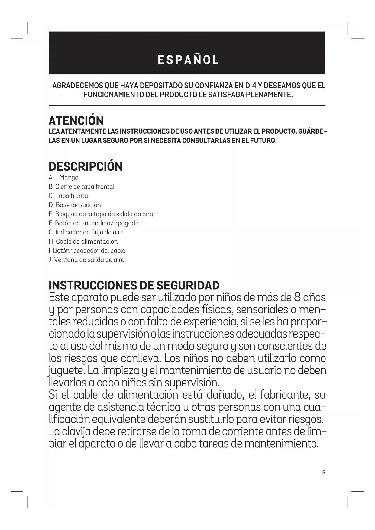 AGRADECEMOS QUE HAYA DEPOSITADO SU CONFIANZA EN DI4 Y DESEAMOS QUE EL FUNCIONAMIENTO DEL PRODUCTO LE SATISFAGA PLENAMENTE. ATENCIÓN LEA ATENTAMENTE LAS INSTRUCCIONES DE USO ANTES DE UTILIZAR EL PRODUCTO. GUÁRDE- LAS EN UN LUGAR SEGURO POR SI NECESITA CONSULTARLAS EN EL FUTURO. DESCRIPCIÓN A Mango B Cierre de tapa frontal C Tapa frontal D Base de succión E Bloqueo de la tapa de salida de aire F Botón de encendido/apagado G Indicador de flujo de aire H Cable de alimentacion I Botón recogedor del cable J Ventana de salida de aire