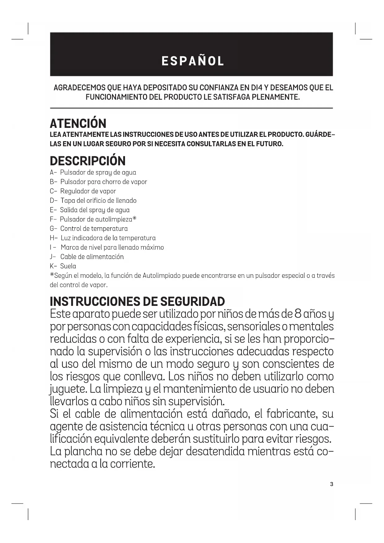AGRADECEMOS QUE HAYA DEPOSITADO SU CONFIANZA EN DI4 Y DESEAMOS QUE EL FUNCIONAMIENTO DEL PRODUCTO LE SATISFAGA PLENAMENTE. ATENCIÓN LEA ATENTAMENTE LAS INSTRUCCIONES DE USO ANTES DE UTILIZAR EL PRODUCTO. GUÁRDE- LAS EN UN LUGAR SEGURO POR SI NECESITA CONSULTARLAS EN EL FUTURO. DESCRIPCIÓN A- Pulsador de spray de agua B- Pulsador para chorro de vapor C- Regulador de vapor D- Tapa del orificio de llenado E- Salida del spray de agua F- Pulsador de autolimpieza* G- Control de temperatura H- Luz indicadora de la temperatura I - Marca de nivel para llenado máximo J- Cable de alimentación K- Suela *Según el modelo, la función de Autolimpiado puede encontrarse en un pulsador especial o a través del control de vapor.
