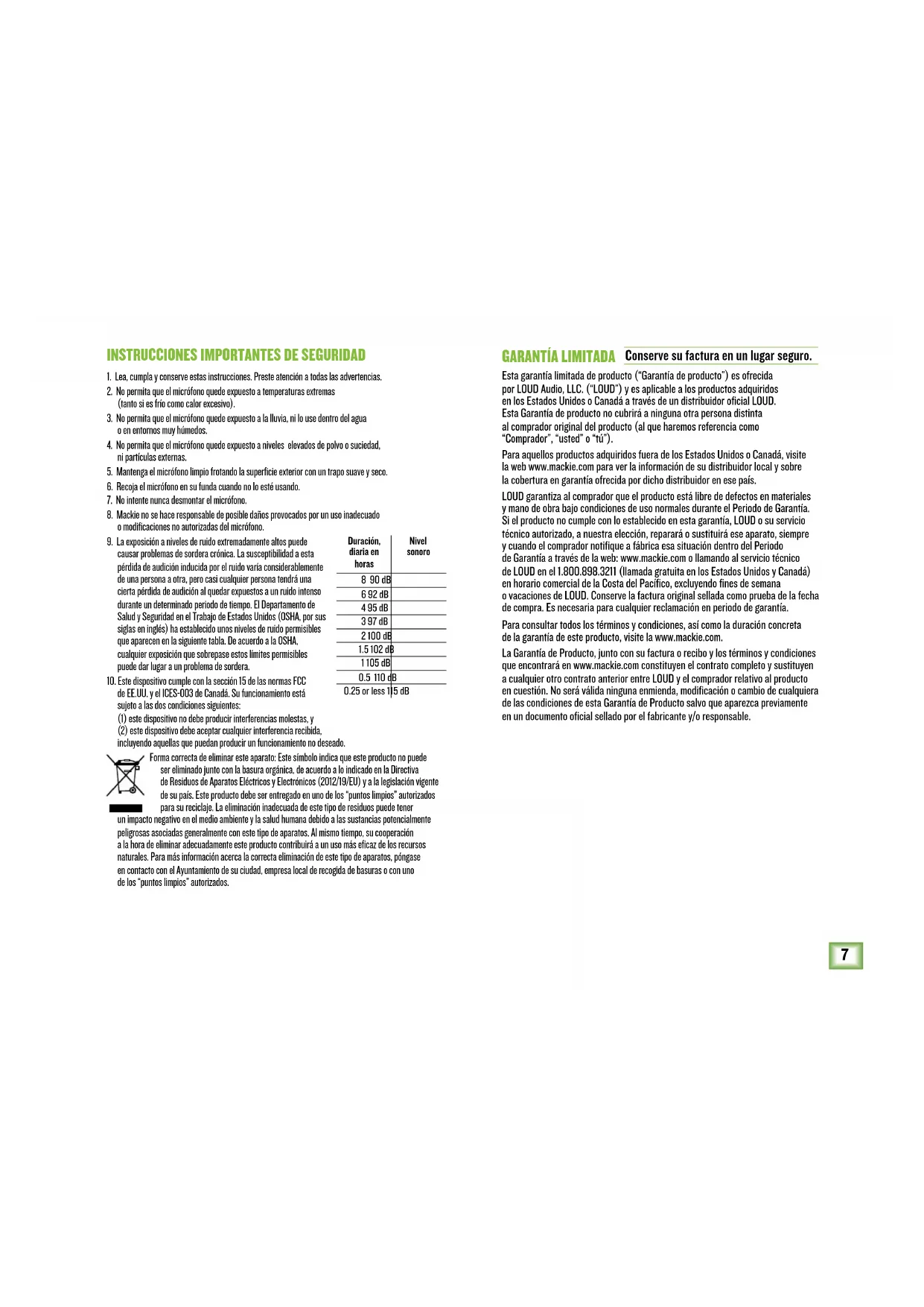 Esta garantía limitada de producto (“Garantía de producto”) es ofrecida por LOUD Audio, LLC. (“LOUD”) y es aplicable a los productos adquiridos en los Estados Unidos o Canadá a través de un distribuidor oficial LOUD. Esta Garantía de producto no cubrirá a ninguna otra persona distinta al comprador original del producto (al que haremos referencia como “Comprador”, “usted” o “tú”). Para aquellos productos adquiridos fuera de los Estados Unidos o Canadá, visite la web www.mackie.com para ver la información de su distribuidor local y sobre la cobertura en garantía ofrecida por dicho distribuidor en ese país. LOUD garantiza al comprador que el producto está libre de defectos en materiales y mano de obra bajo condiciones de uso normales durante el Periodo de Garantía. Si el producto no cumple con lo establecido en esta garantía, LOUD o su servicio técnico autorizado, a nuestra elección, reparará o sustituirá ese aparato, siempre y cuando el comprador notifique a fábrica esa situación dentro del Periodo de Garantía a través de la web: www.mackie.com o llamando al servicio técnico de LOUD en el 1.800.898.3211 (llamada gratuita en los Estados Unidos y Canadá) en horario comercial de la Costa del Pacífico, excluyendo fines de semana o vacaciones de LOUD. Conserve la factura original sellada como prueba de la fecha de compra. Es necesaria para cualquier reclamación en periodo de garantía. Para consultar todos los términos y condiciones, así como la duración concreta de la garantía de este producto, visite la www.mackie.com. La Garantía de Producto, junto con su factura o recibo y los términos y condiciones que encontrará en www.mackie.com constituyen el contrato completo y sustituyen a cualquier otro contrato anterior entre LOUD y el comprador relativo al producto en cuestión. No será válida ninguna enmienda, modificación o cambio de cualquiera de las condiciones de esta Garantía de Producto salvo que aparezca previamente en un documento oficial sellado por el fabricante y/o responsable. Forma correcta de eliminar este aparato: Este símbolo indica que este producto no puede ser eliminado junto con la basura orgánica, de acuerdo a lo indicado en la Directiva de Residuos de Aparatos Eléctricos y Electrónicos (2012/19/EU) y a la legislación vigente de su país. Este producto debe ser entregado en uno de los “puntos limpios” autorizados para su reciclaje. La eliminación inadecuada de este tipo de residuos puede tener un impacto negativo en el medio ambiente y la salud humana debido a las sustancias potencialmente peligrosas asociadas generalmente con este tipo de aparatos. Al mismo tiempo, su cooperación a la hora de eliminar adecuadamente este producto contribuirá a un uso más eficaz de los recursos naturales. Para más información acerca la correcta eliminación de este tipo de aparatos, póngase en contacto con el Ayuntamiento de su ciudad, empresa local de recogida de basuras o con uno de los “puntos limpios” autorizados. Duración, diaria en horas Nivel sonoro 8 90 dB 6 92 dB 4 95 dB 3 97 dB 2 100 dB
